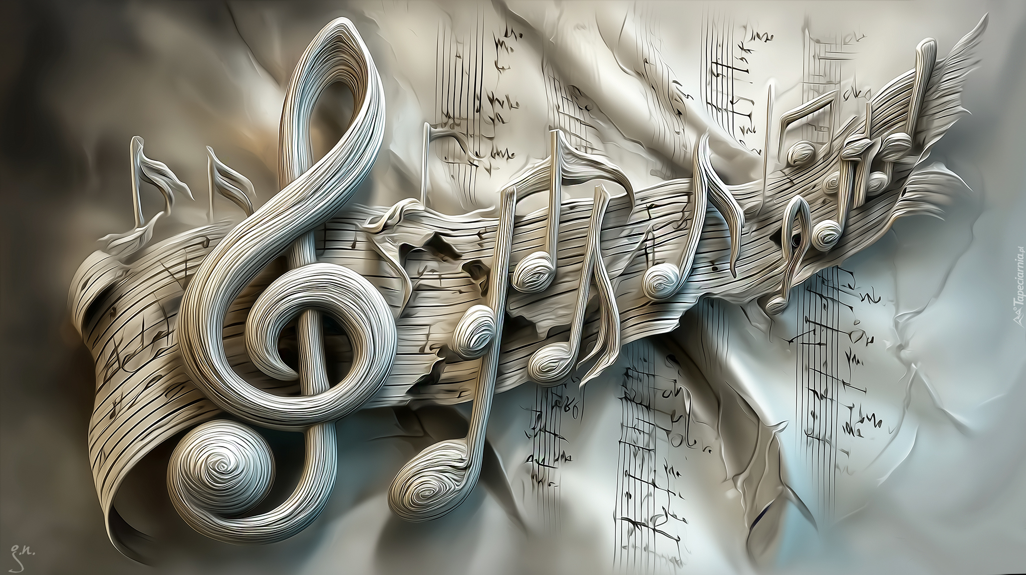 Edytor tapety: Klucz wiolinowy i nuty w grafice AI