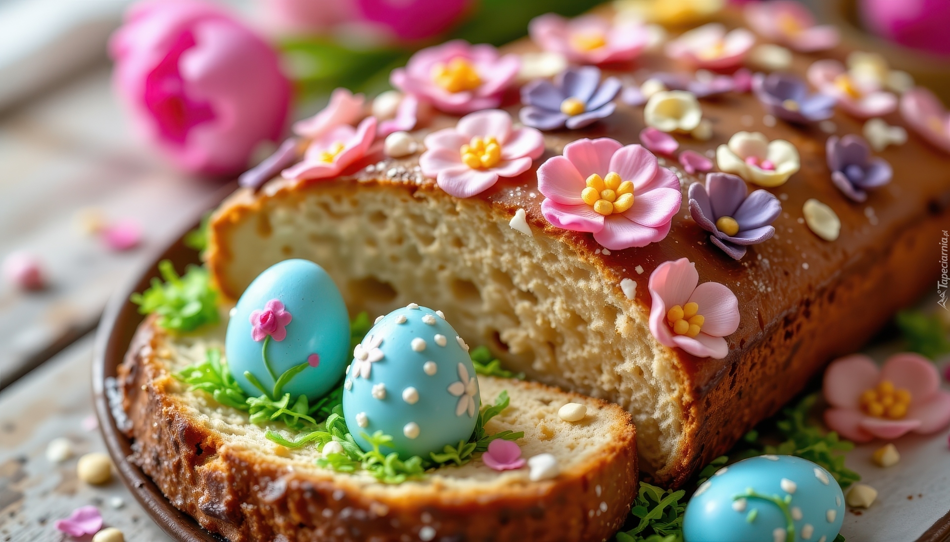 Edytor tapety: Niebieskie pisanki i cukrowe kwiaty na chlebie