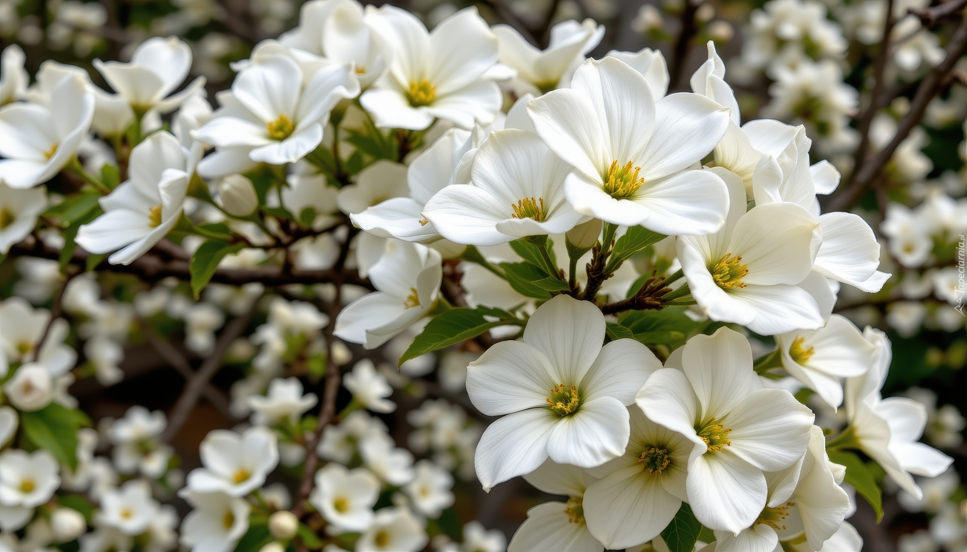 Edytor tapety: Gałązki z białymi rozwiniętymi kwiatami