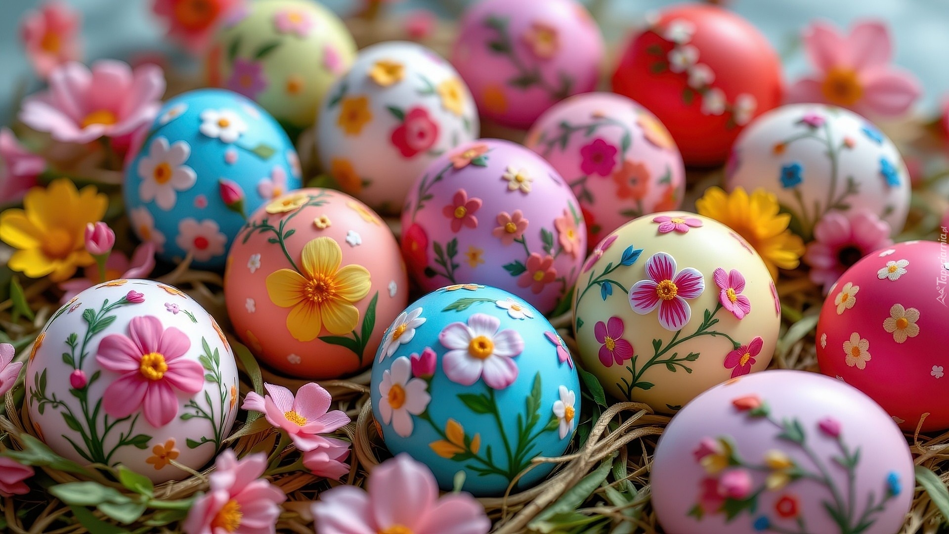 Edytor tapety: Kolorowe pisanki ozdobione kwiatami na trawie