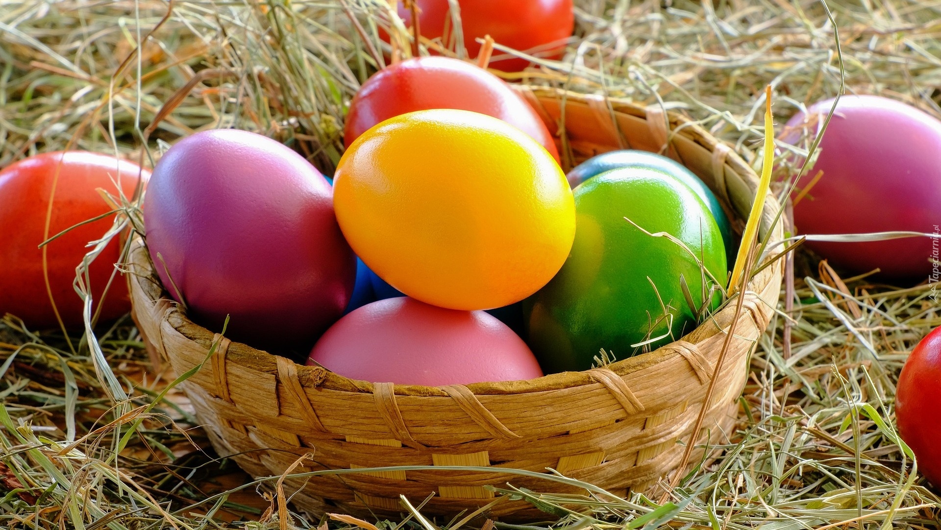 Edytor tapety: Kolorowe jajka w koszyku i obok