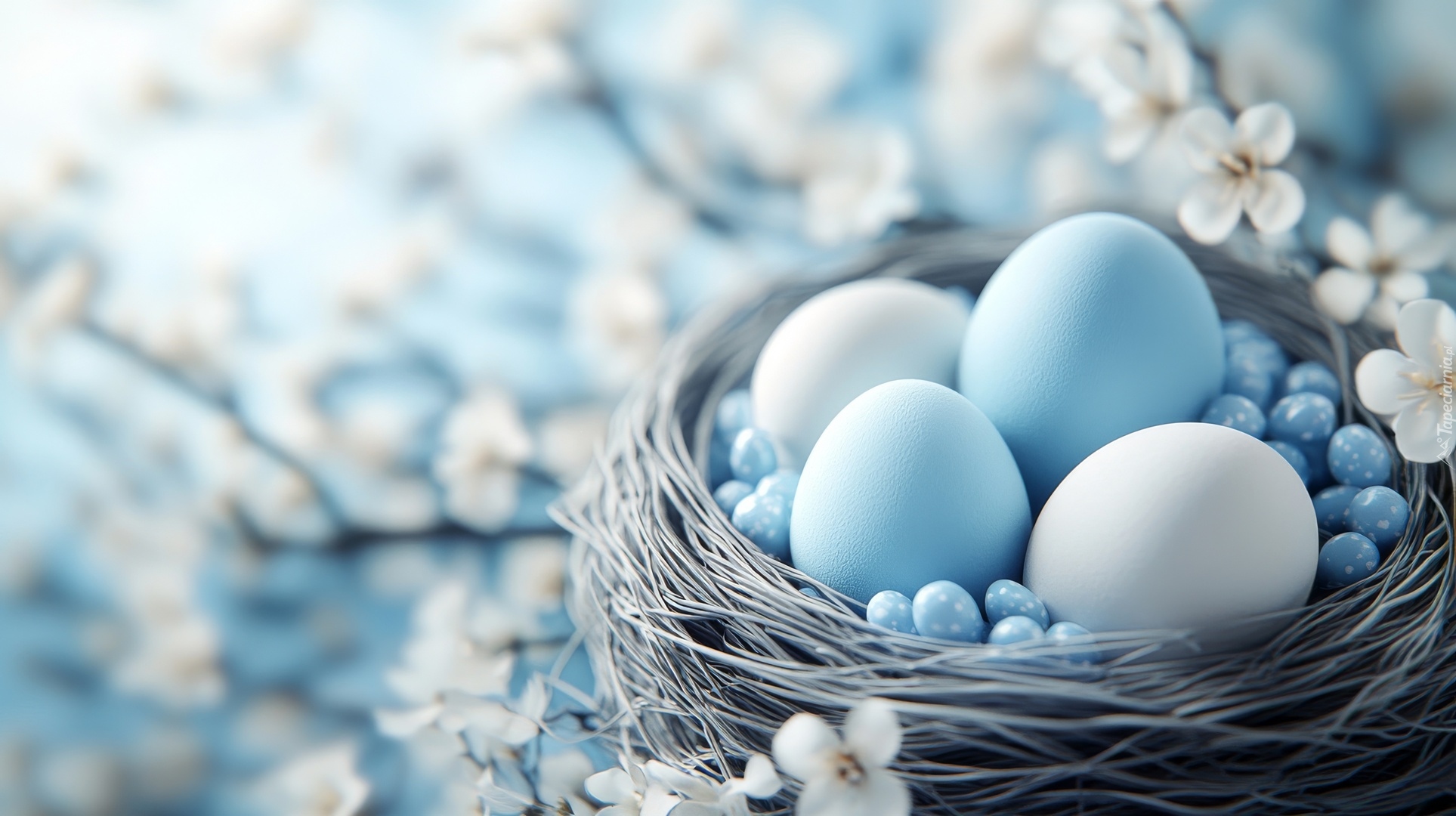 Edytor tapety: Gniazdo z błękitnymi pisankami obok białych drobnych kwiatów