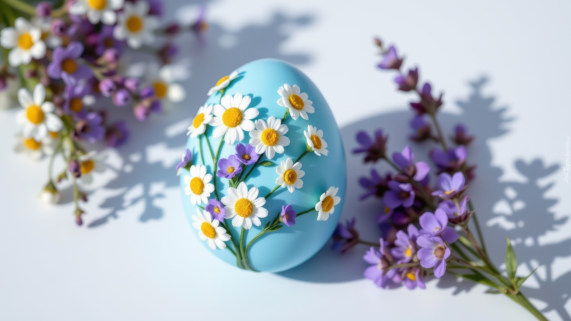 Edytor tapety: Białe i fioletowe kwiaty obok niebieskiego jajka