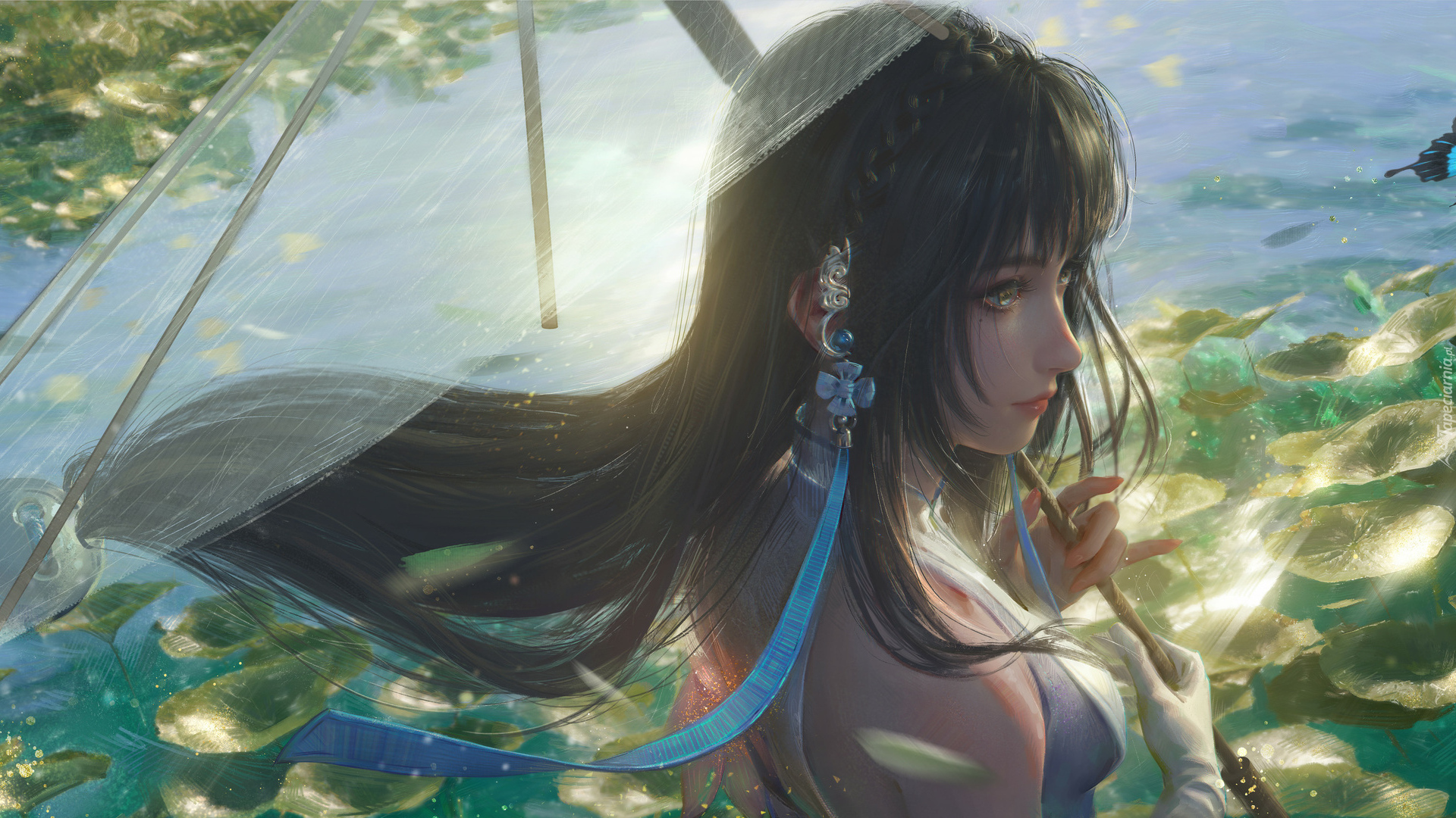Edytor tapety: Długowłosa dziewczyna z przezroczystą parasolką w grafice