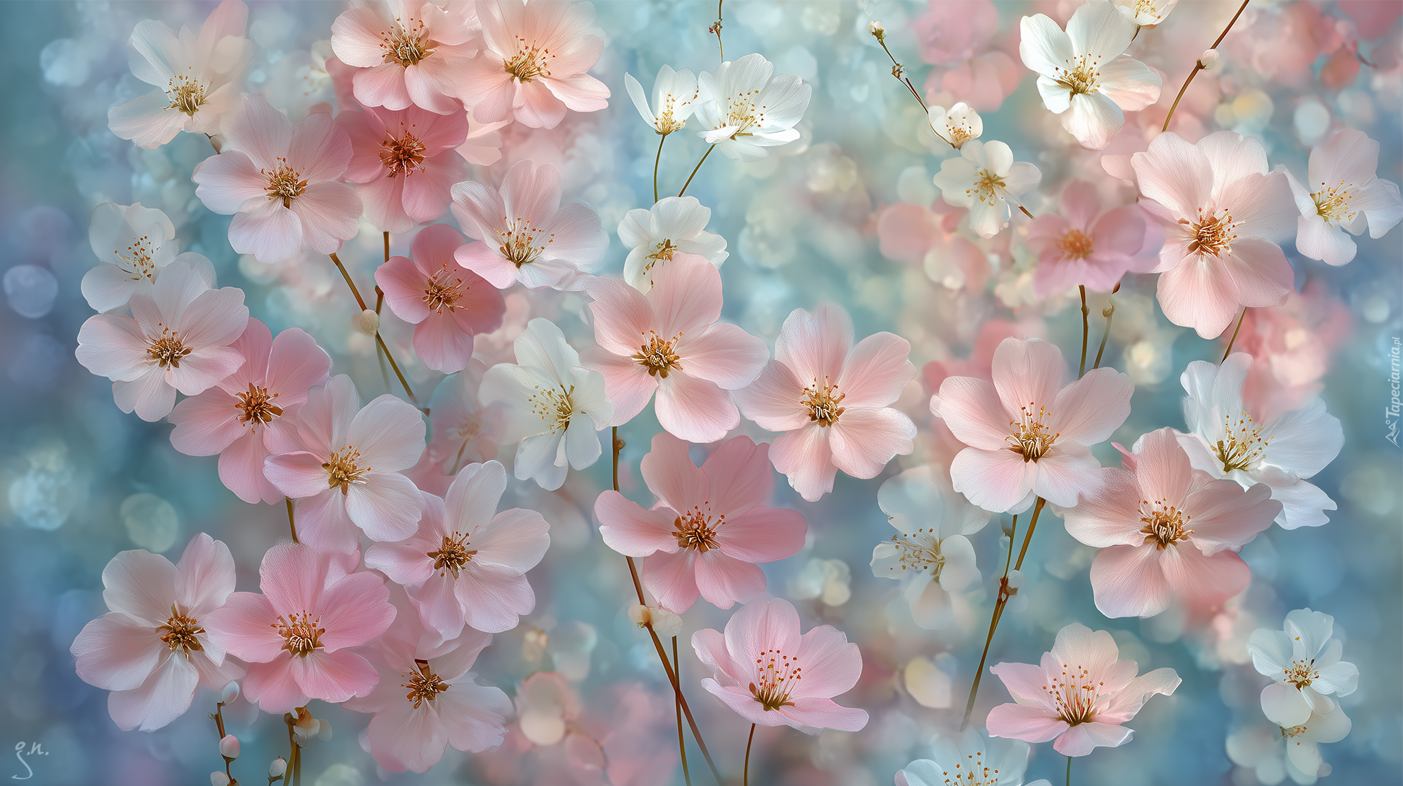 Edytor tapety: Drobne różowe i białe kwiaty na niebieskim tle