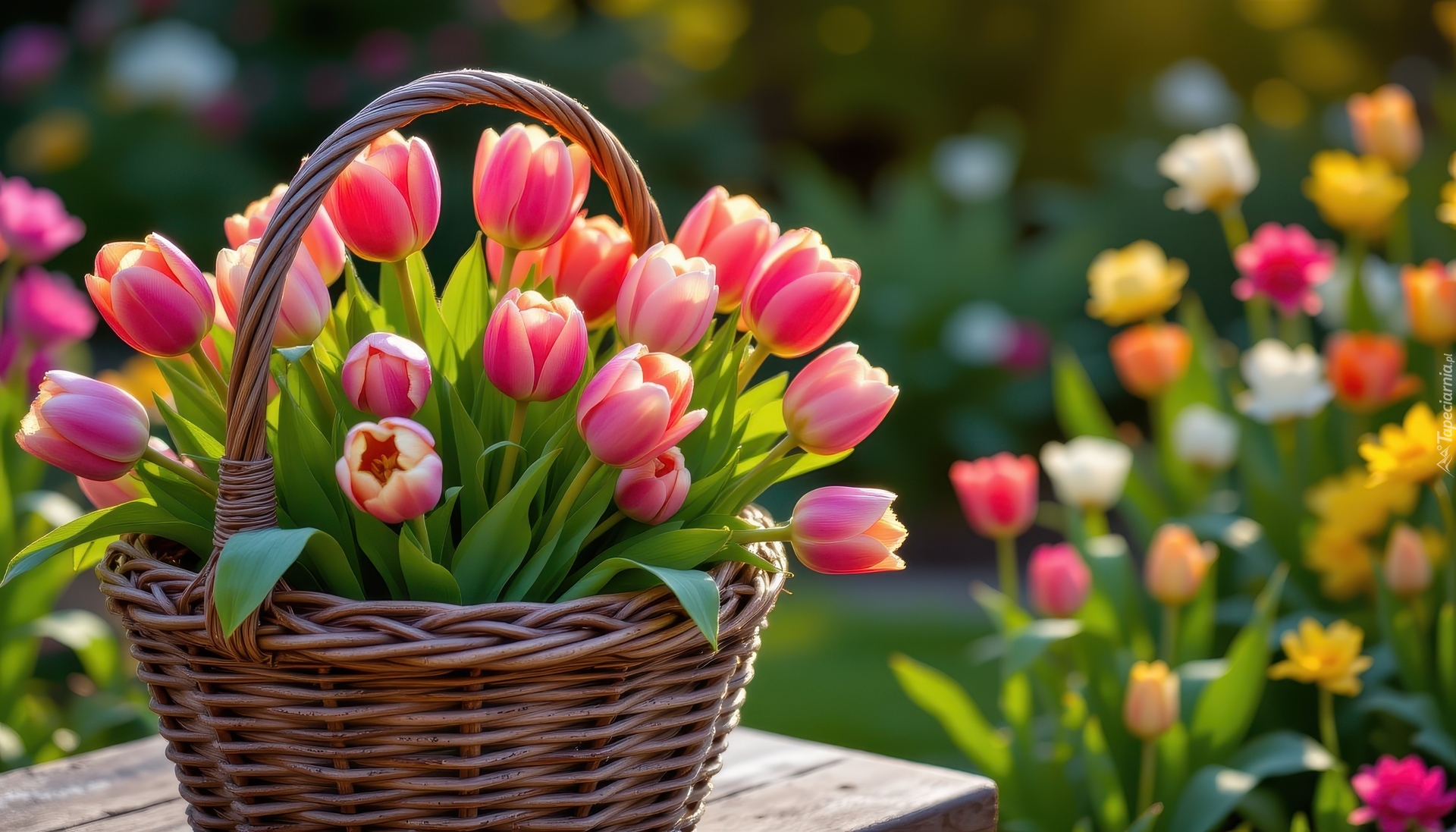 Edytor tapety: Wiklinowy koszyk z różowymi tulipanami na stole