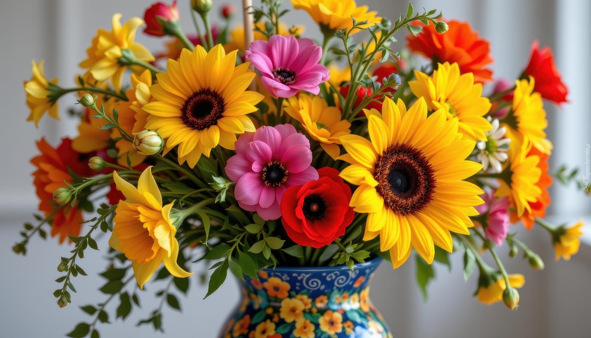 Edytor tapety: Bukiet kolorowych kwiatów w kolorowym wazonie