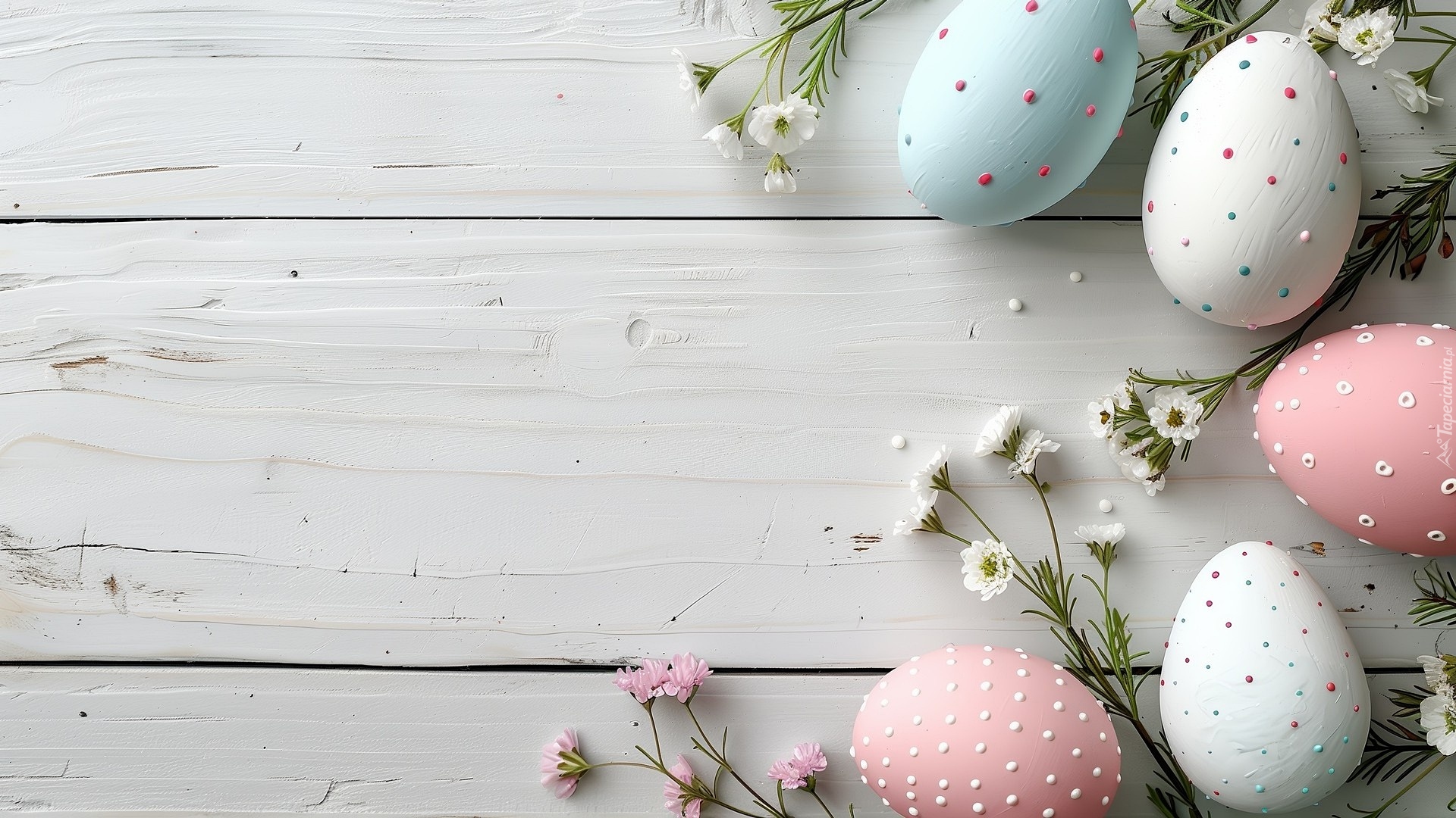 Edytor tapety: Nakrapiane pisanki i drobne kwiatki na jasnych deskach