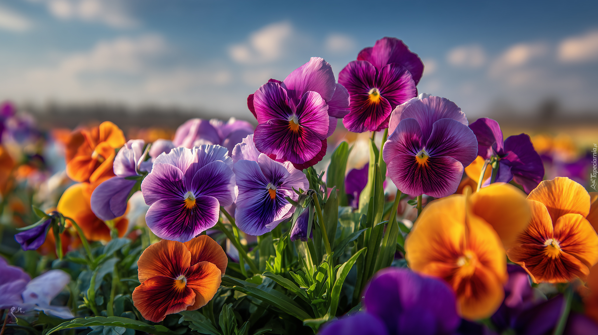 Edytor tapety: Kolorowe bratki na tle nieba