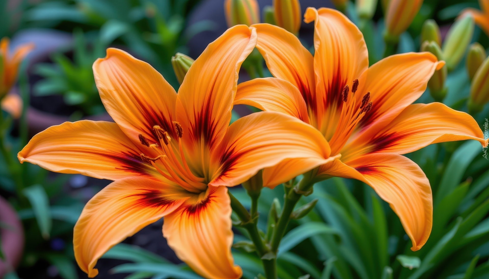 Edytor tapety: Dwie rozkwitnięte pomarańczowe lilie w zbliżeniu