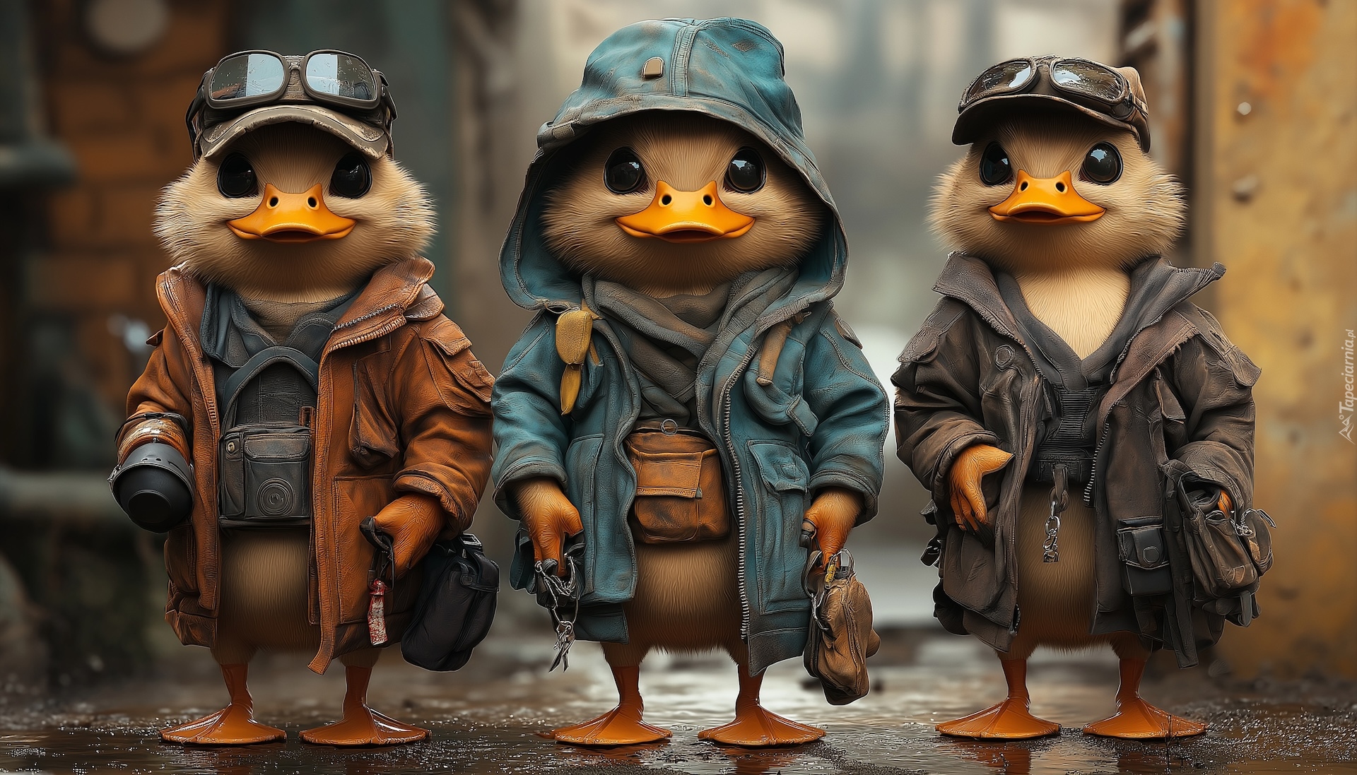 Edytor tapety: Grafika z trzema kaczkami w czapkach i ubraniach