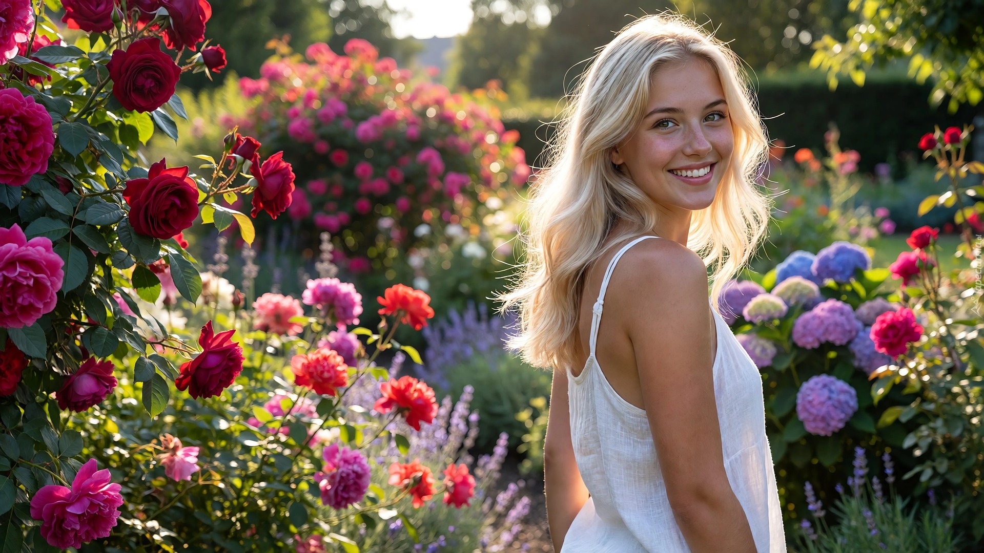 Edytor tapety: Uśmiechnięta blondynka wśród kwiatów w ogrodzie