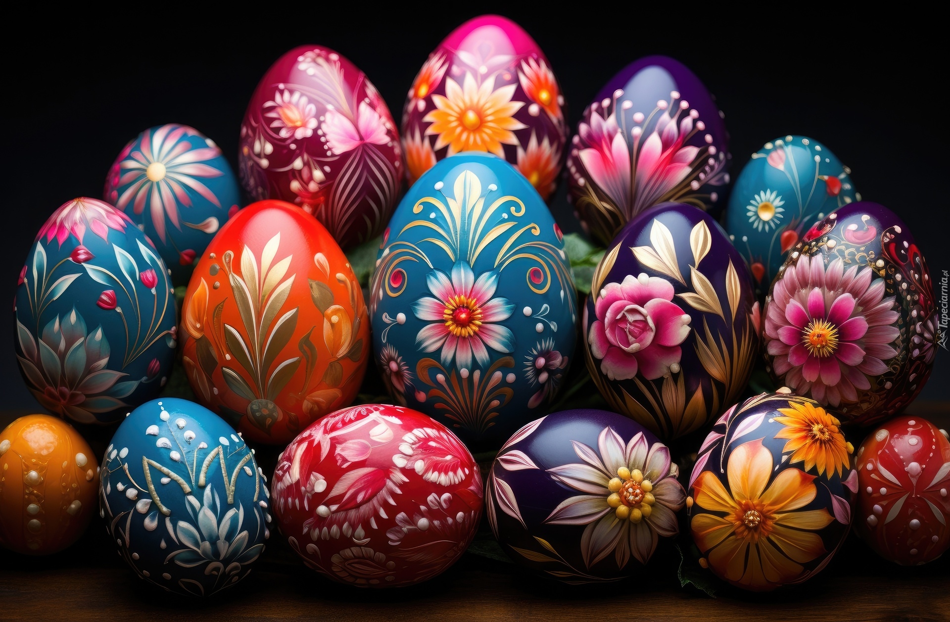 Edytor tapety: Pisanki ozdobione motywem kwiatowym na czarnym tle
