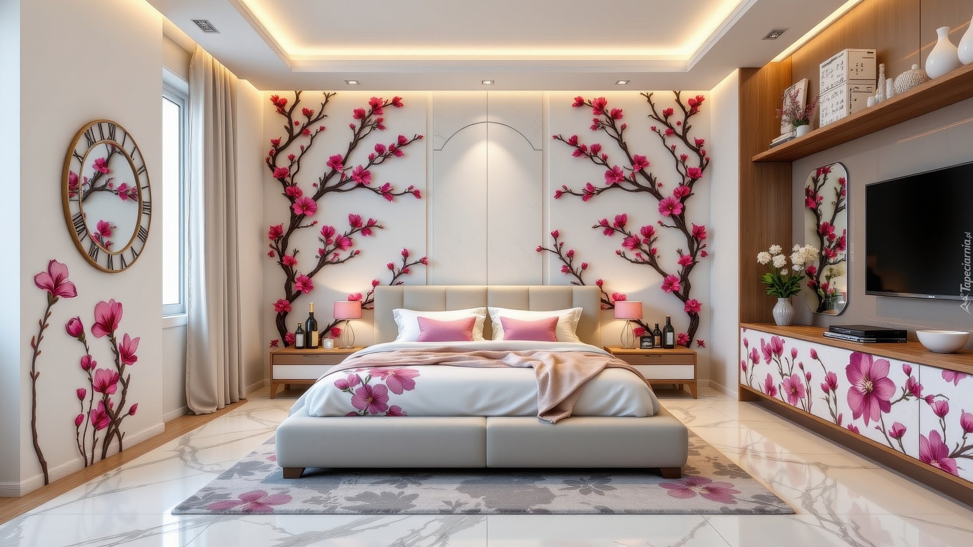 Edytor tapety: Łóżko w sypialni z motywem kwiatowym na ścianach