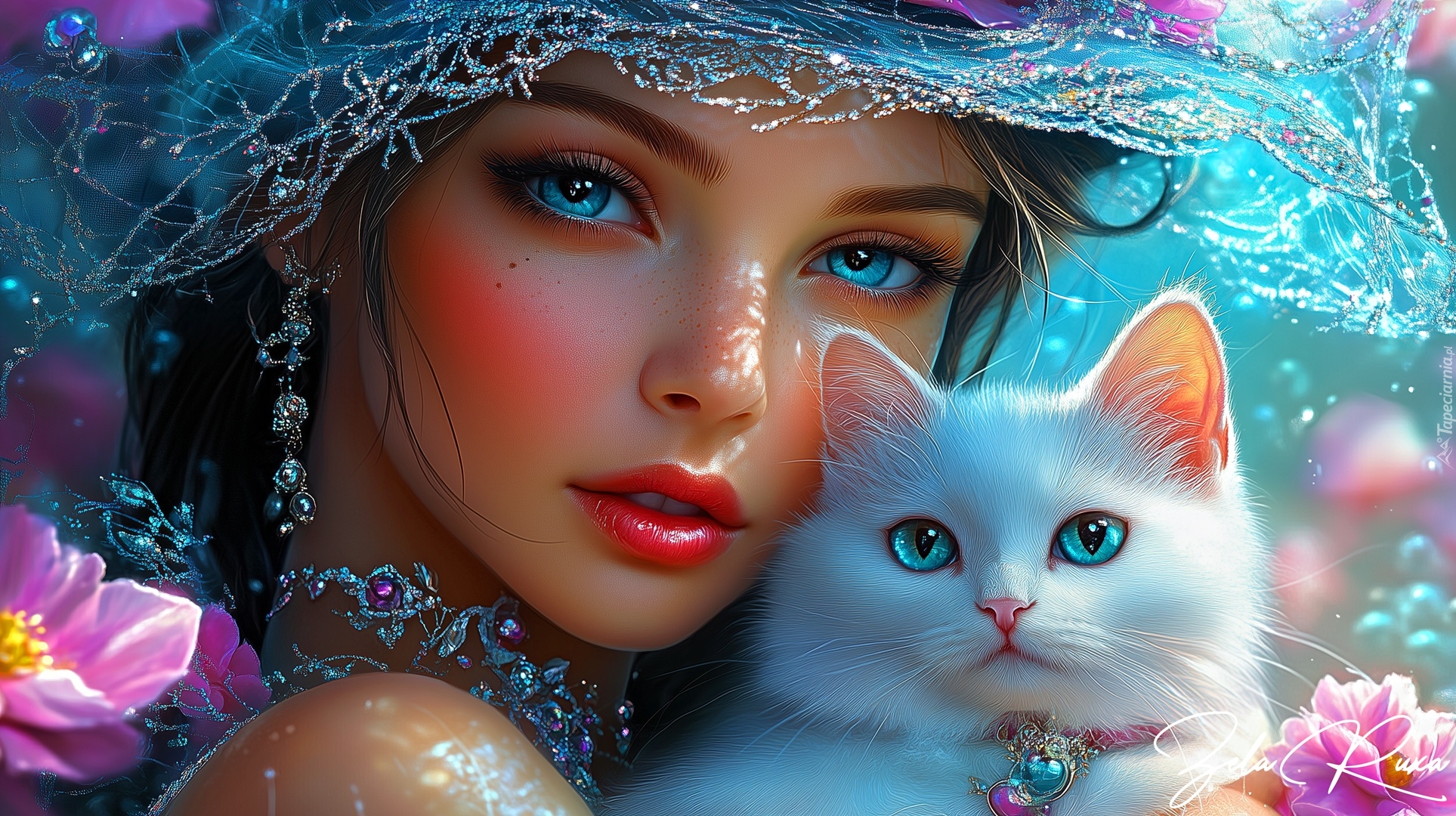 Edytor tapety: Niebieskooka kobieta z białym kotem o niebieskich oczach