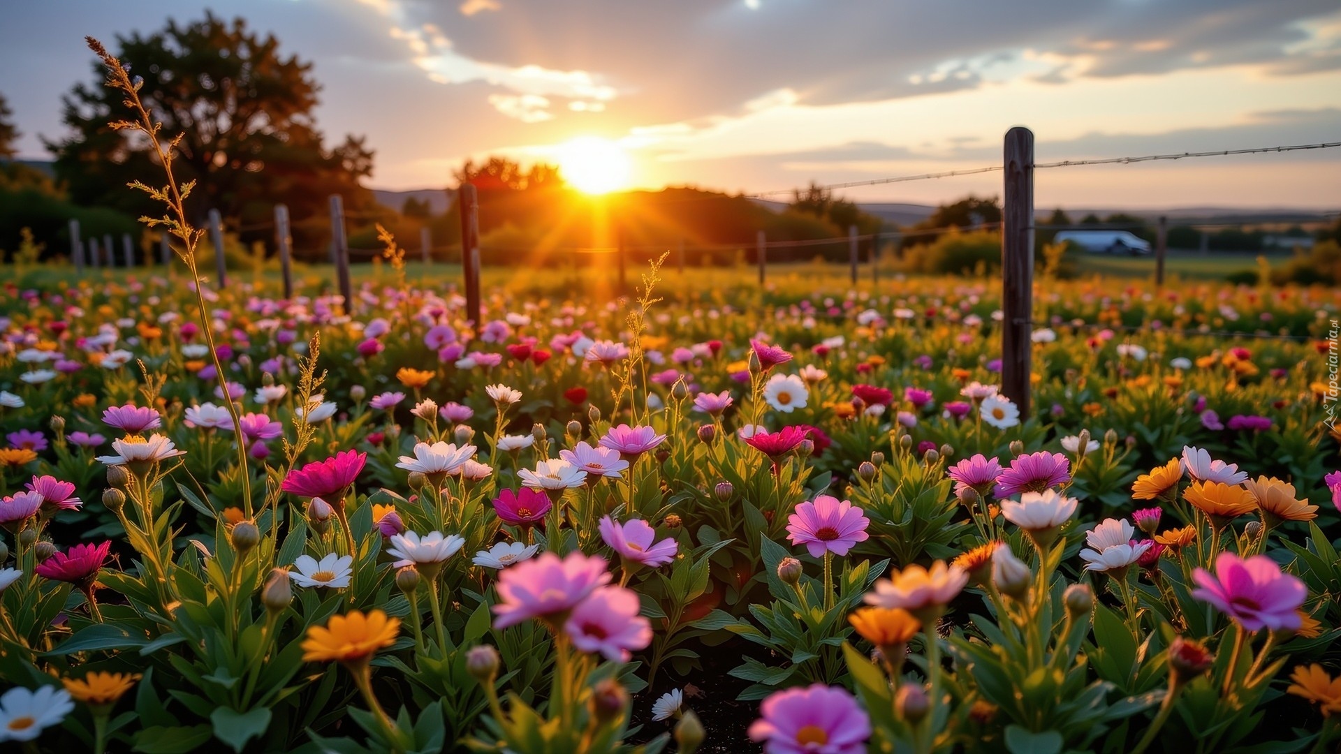 Edytor tapety: Ogrodzenie na ukwieconej łące w promieniach zachodzącego słońca