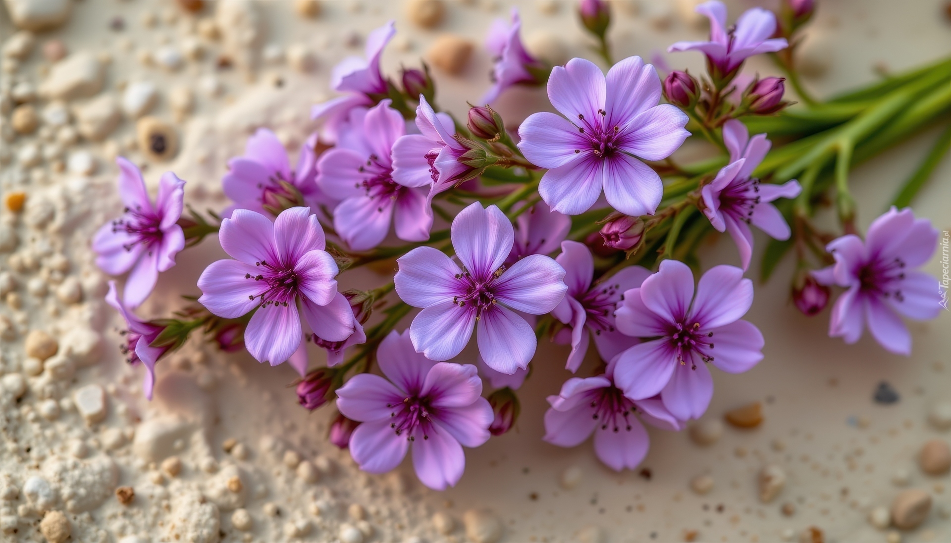 Edytor tapety: Gałązki z drobnymi fioletowymi kwiatami ułożone na piasku