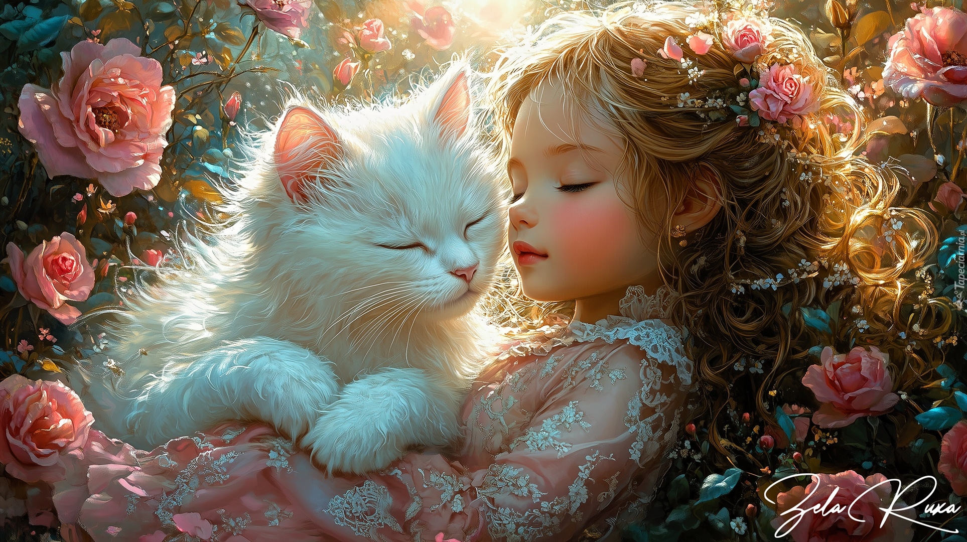 Edytor tapety: Śpiąca dziewczynka z białym kotem wśród różowych róż