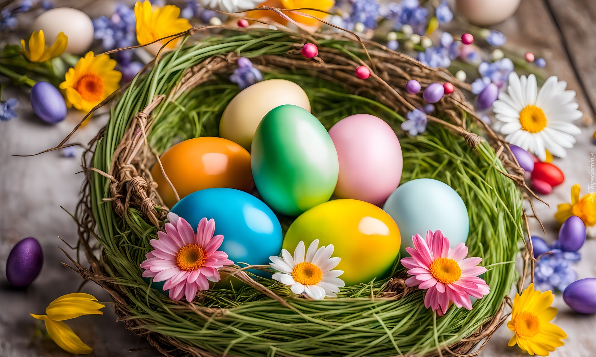 Edytor tapety: Gniazdko z kolorowymi pisankami i kwiatami