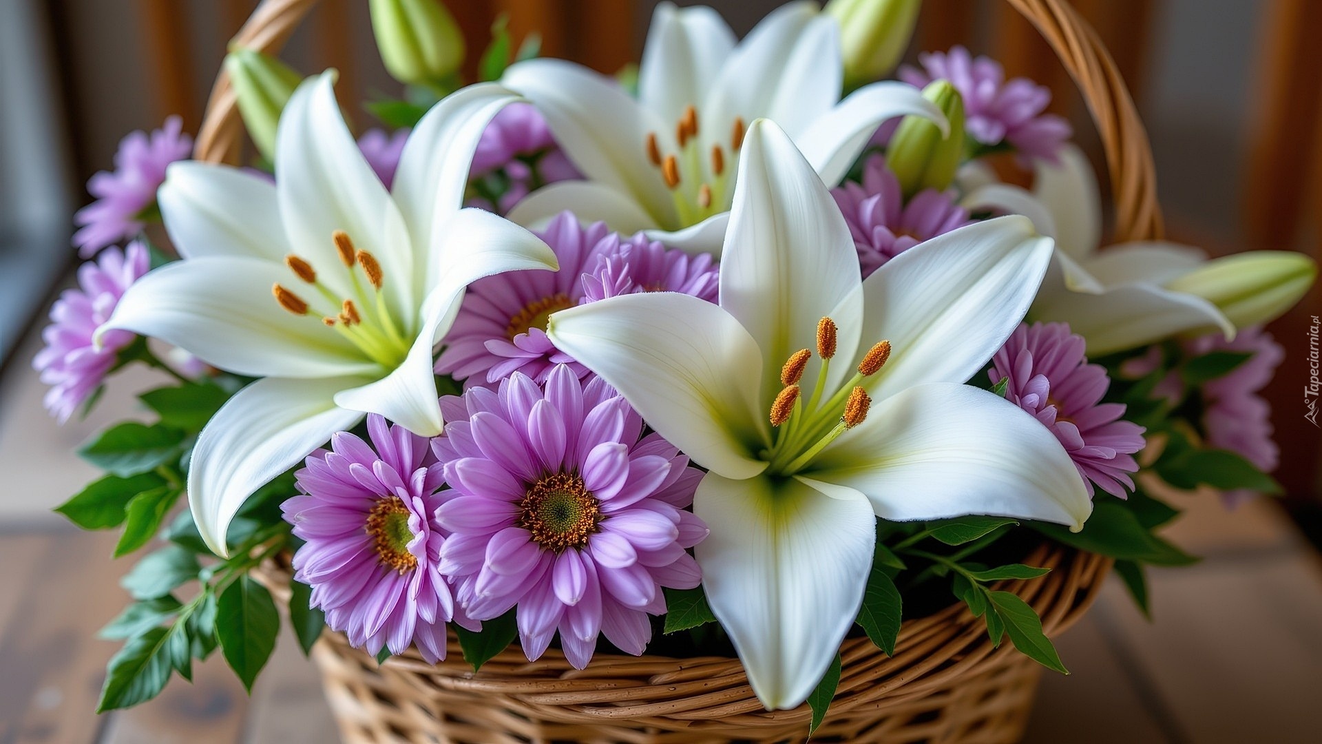 Edytor tapety: Białe lilie i fioletowe astry w koszyku