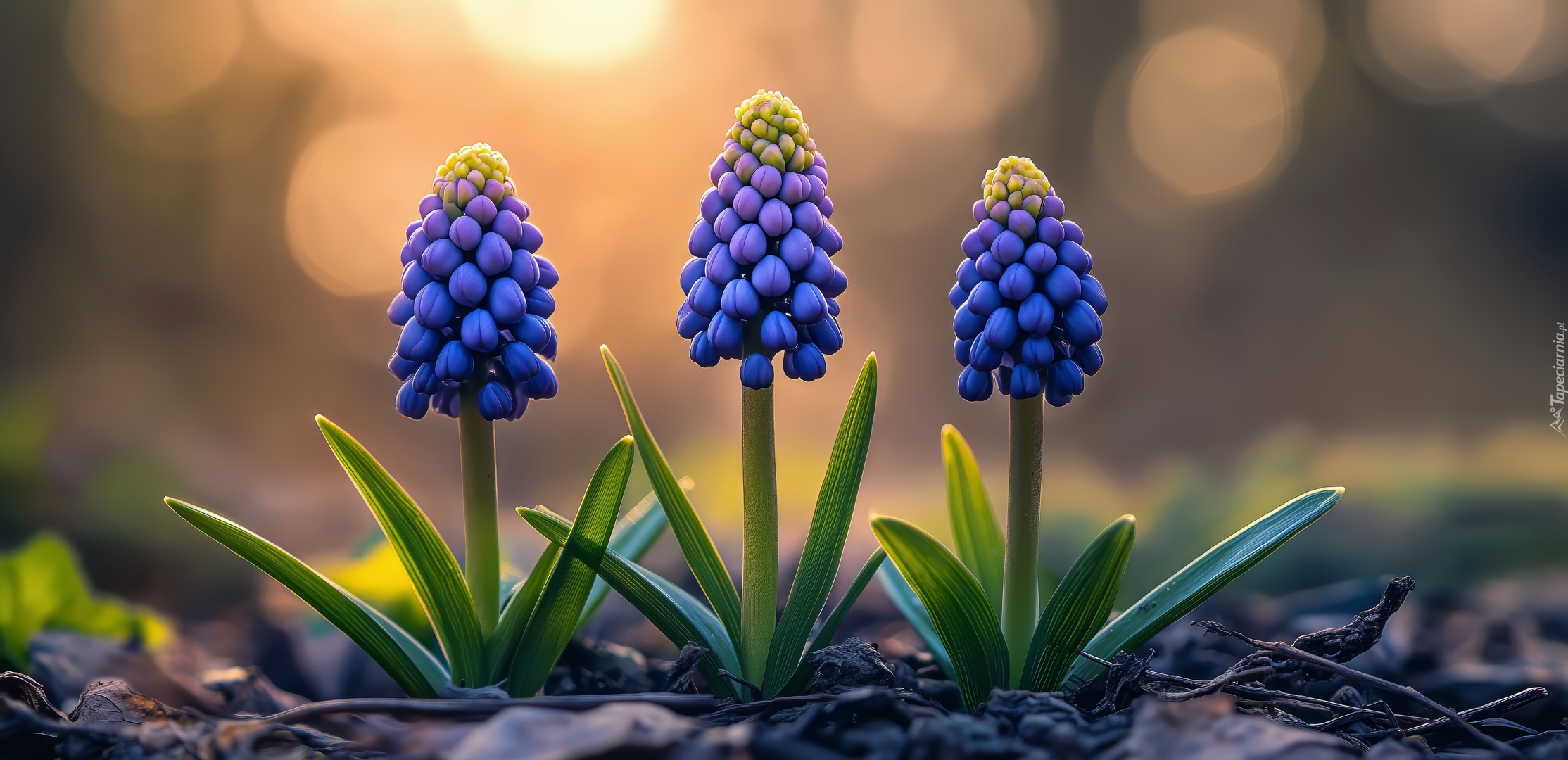 Edytor tapety: Rozświetlone trzy niebieskie szafirki z listkami