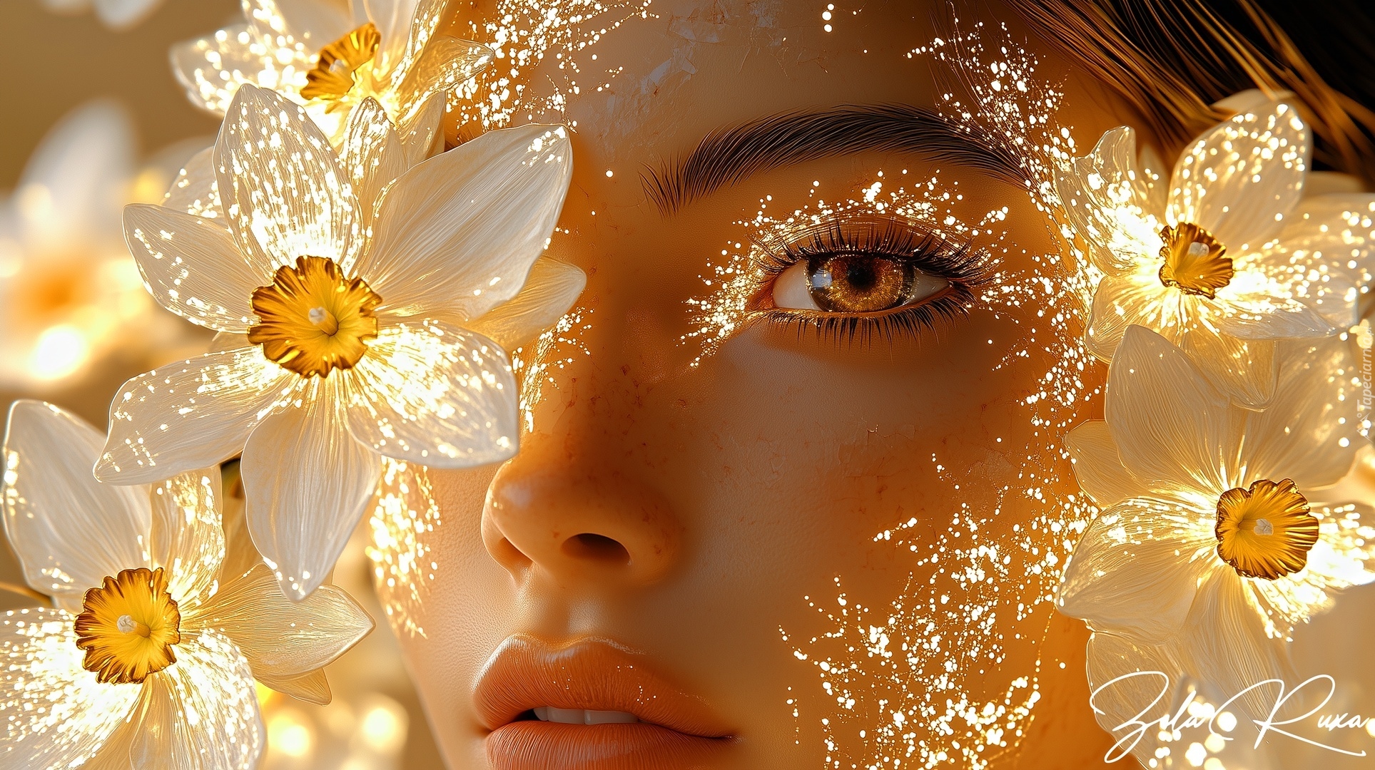 Edytor tapety: Rozświetlone narcyzy wokół twarzy kobiety