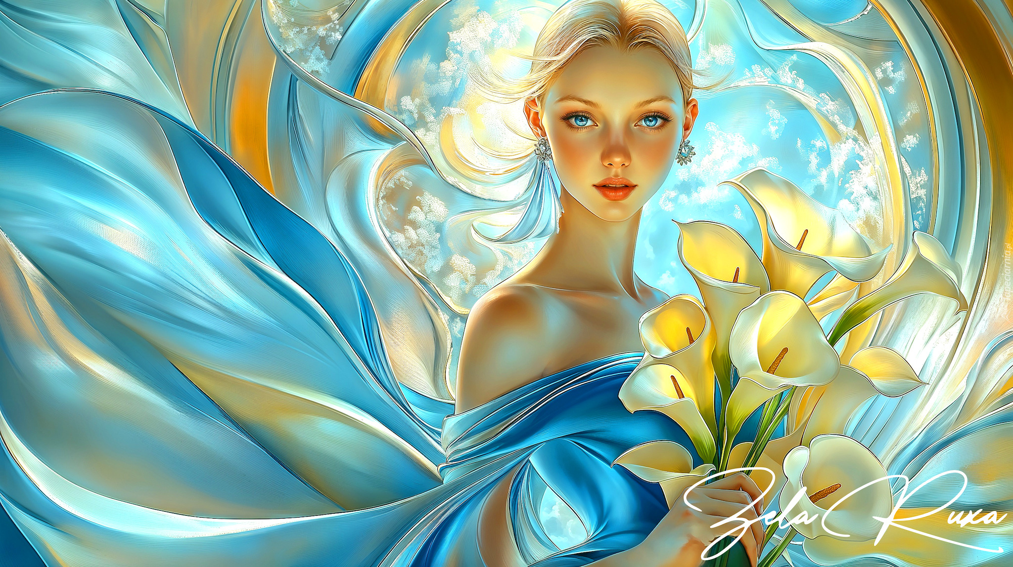 Edytor tapety: Kobieta w niebieskiej sukni z kaliami