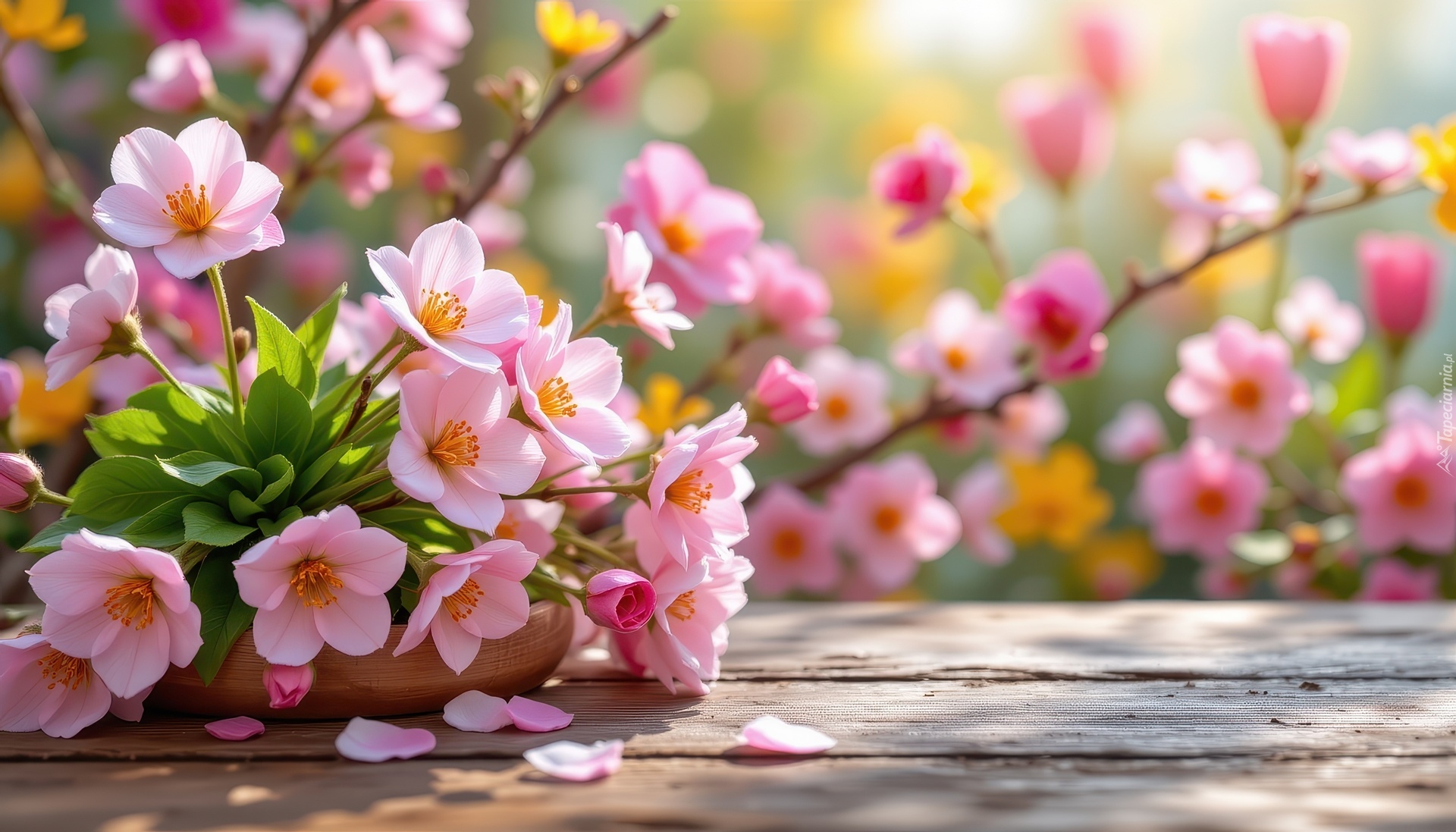 Edytor tapety: Rozświetlone światłem różowe kwiaty na deskach