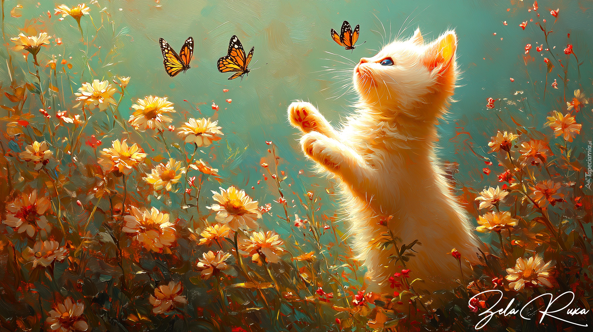 Edytor tapety: Mały biały kotek i motyle nad kwiatami