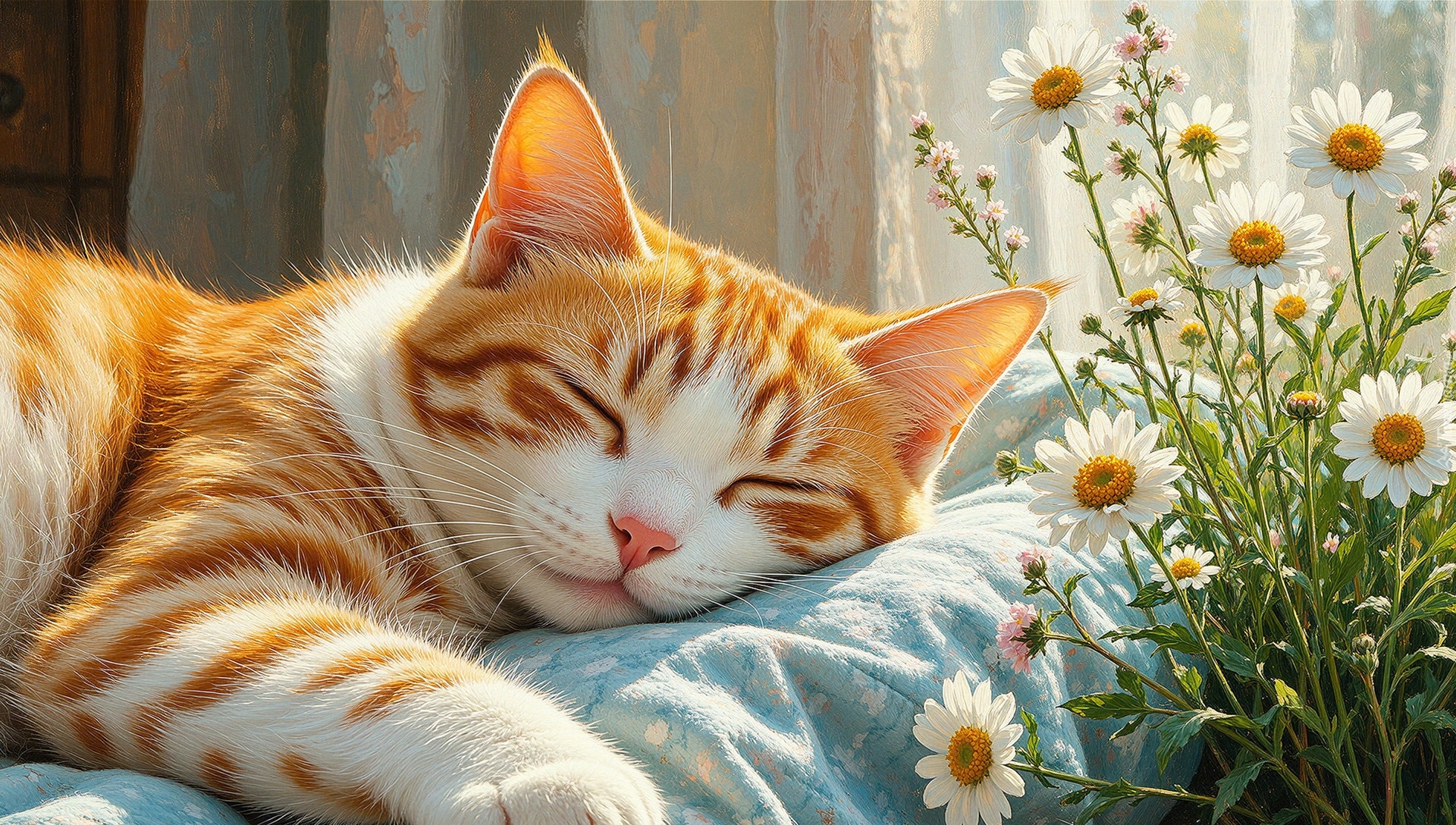 Edytor tapety: Białe kwiaty obok śpiącego rudego kota na poduszce