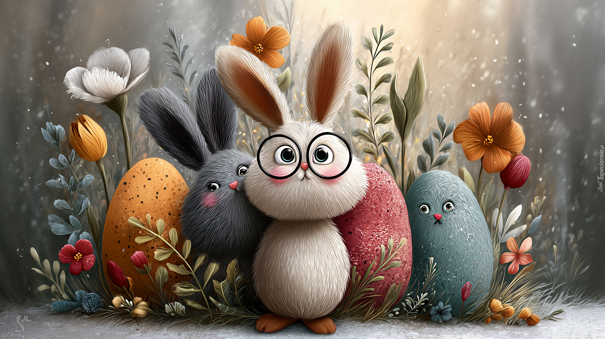Edytor tapety: Zajączki wśród jajek i kolorowych kwiatów