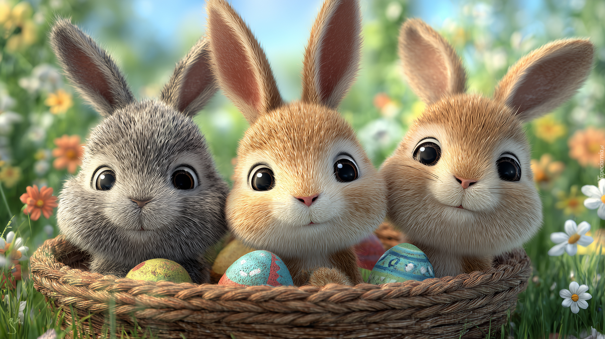 Edytor tapety: Trzy zajączki i pisanki w koszyku