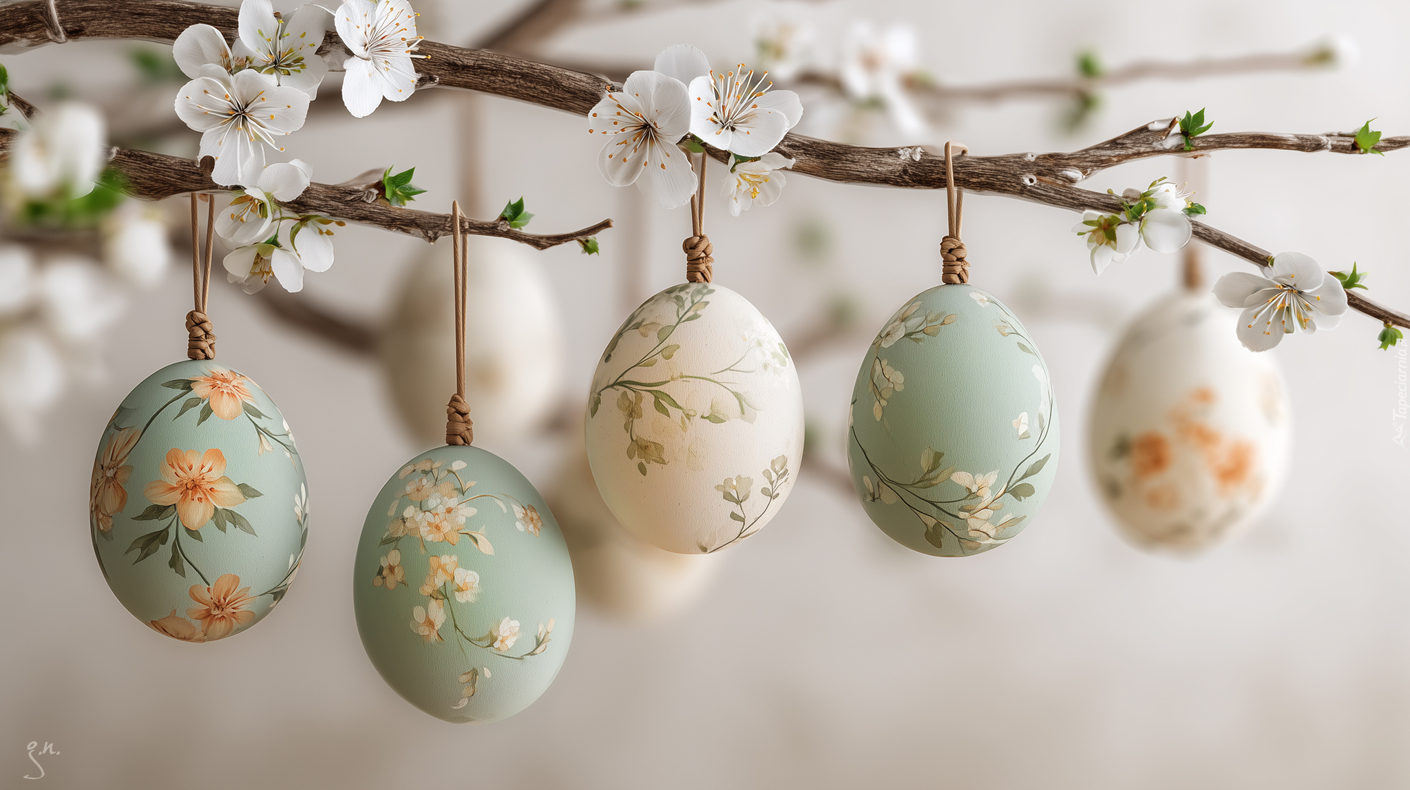 Edytor tapety: Kolorowe pisanki zawieszone na ukwieconej gałązce