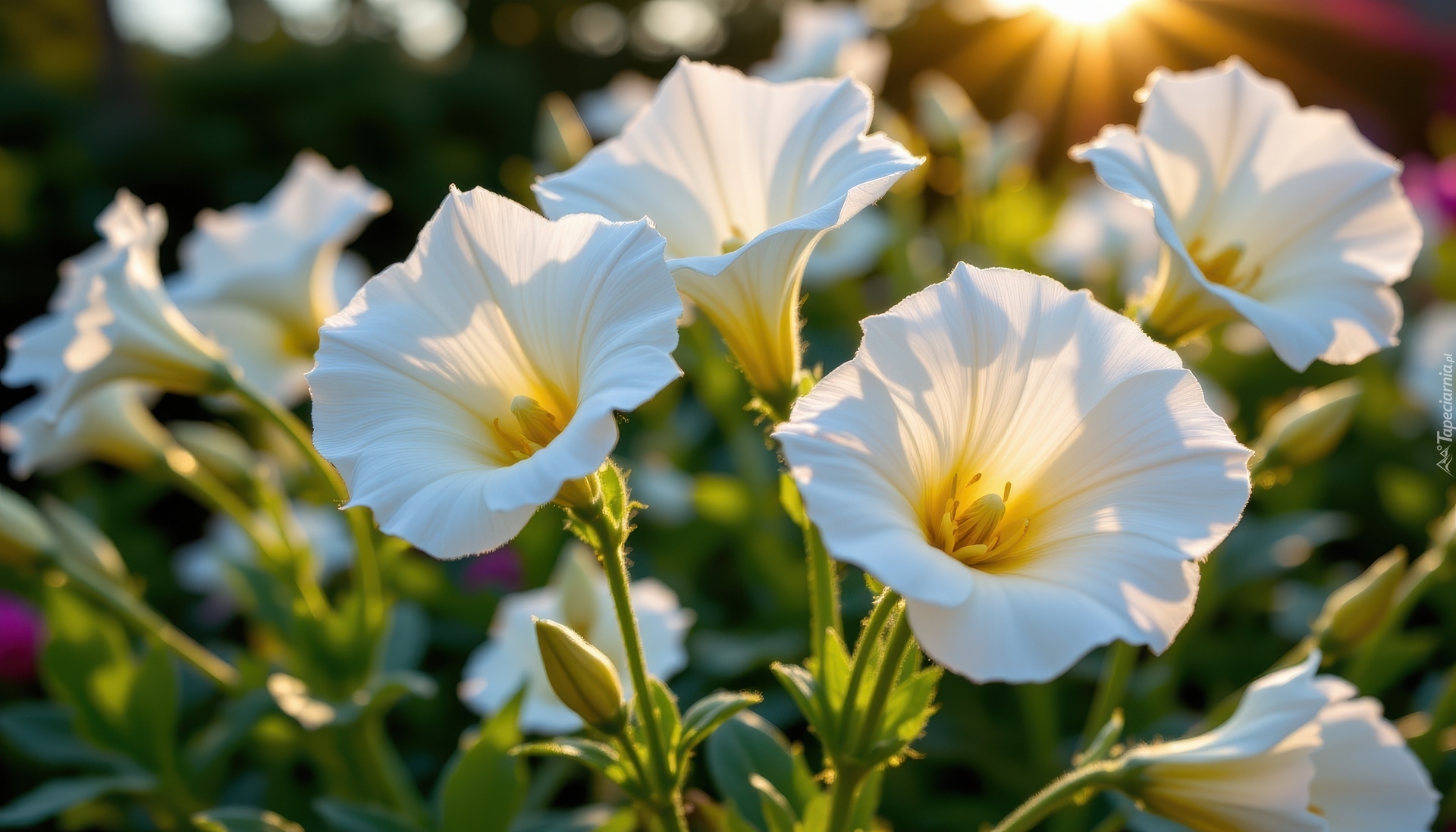 Edytor tapety: Rozświetlone słońcem białe rozwinięte kwiaty