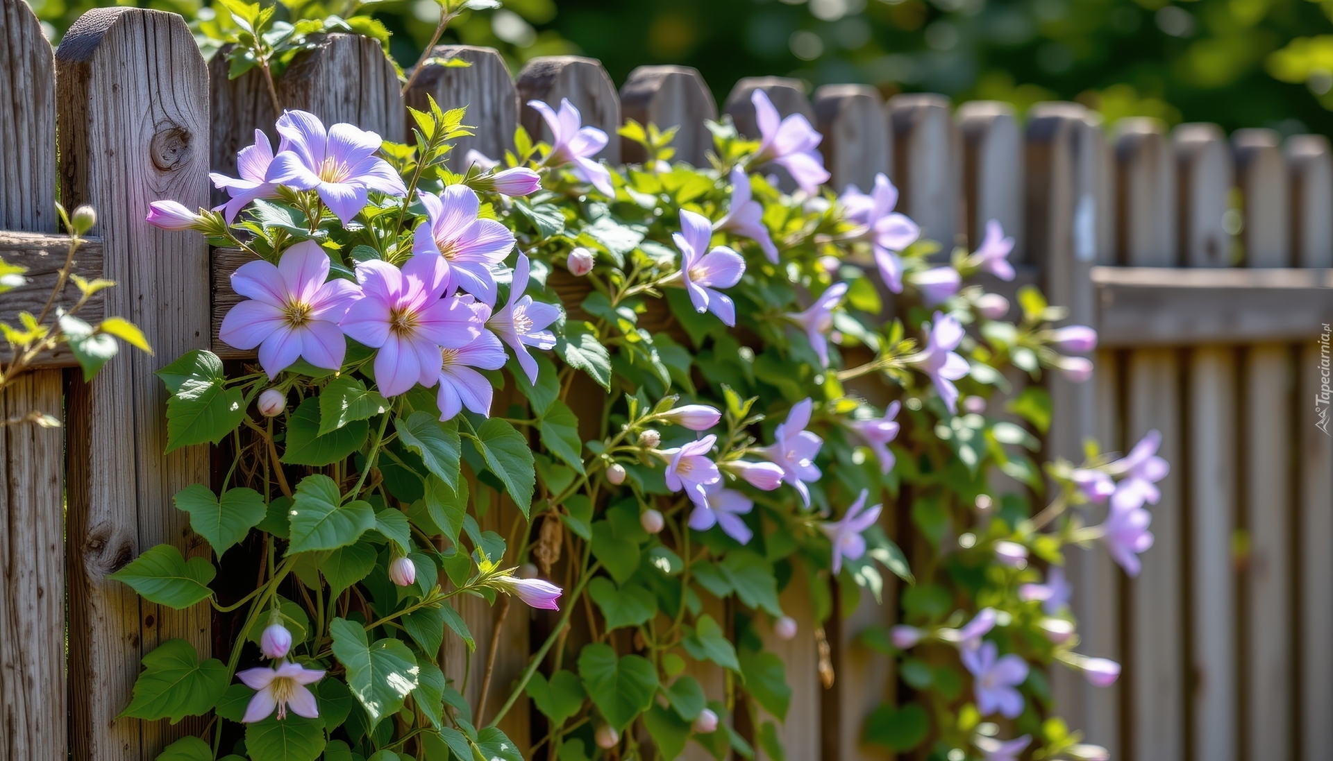 Edytor tapety: Liście i jasnofioletowe kwiaty powojnika na drewnianym płocie