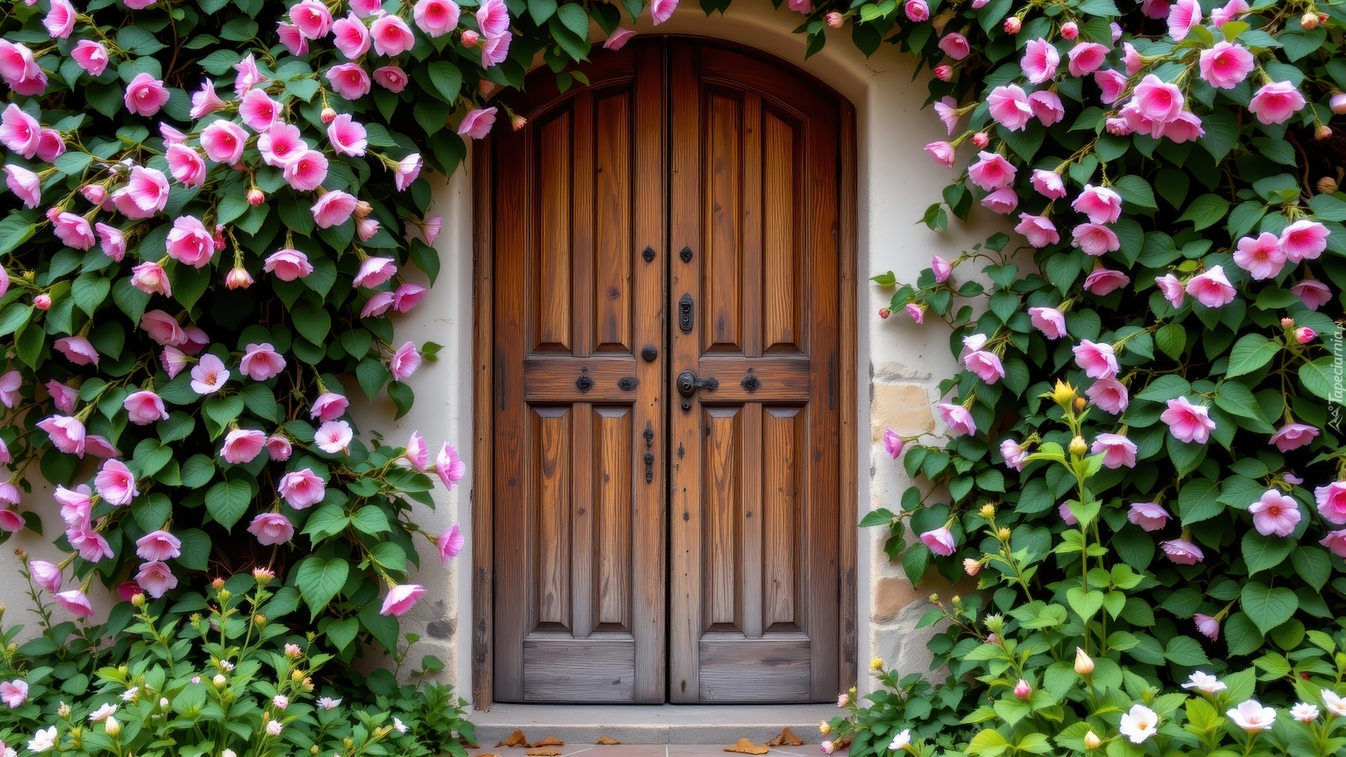 Edytor tapety: Pnące różowe kwiaty na murze przy drewnianych drzwiach