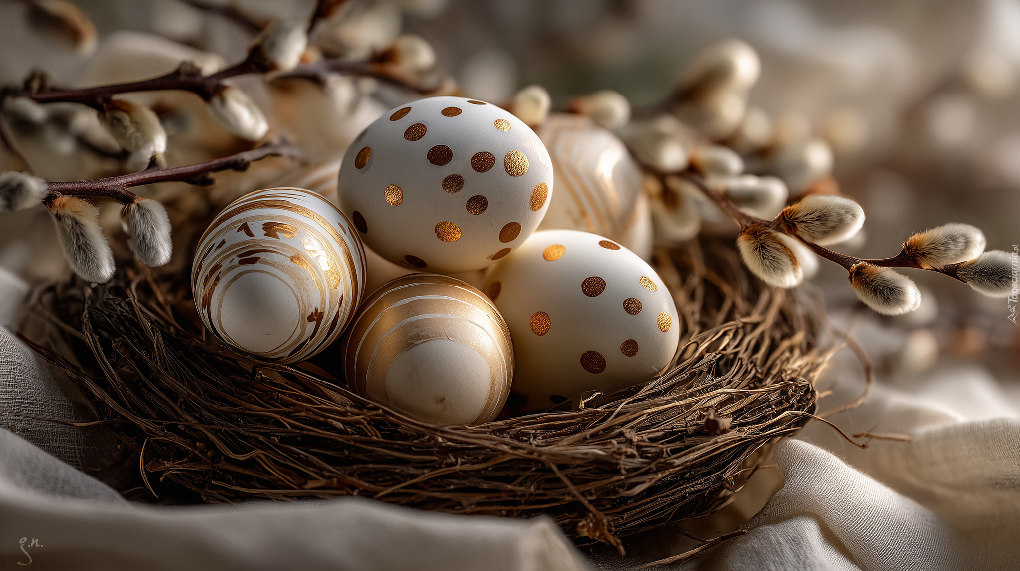 Edytor tapety: Gniazdko z pisankami w złote wzory obok bazi