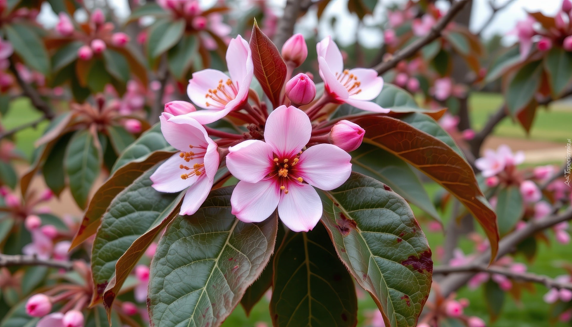 Edytor tapety: Gałązka z różowymi kwiatami i liśćmi drzewa owocowego