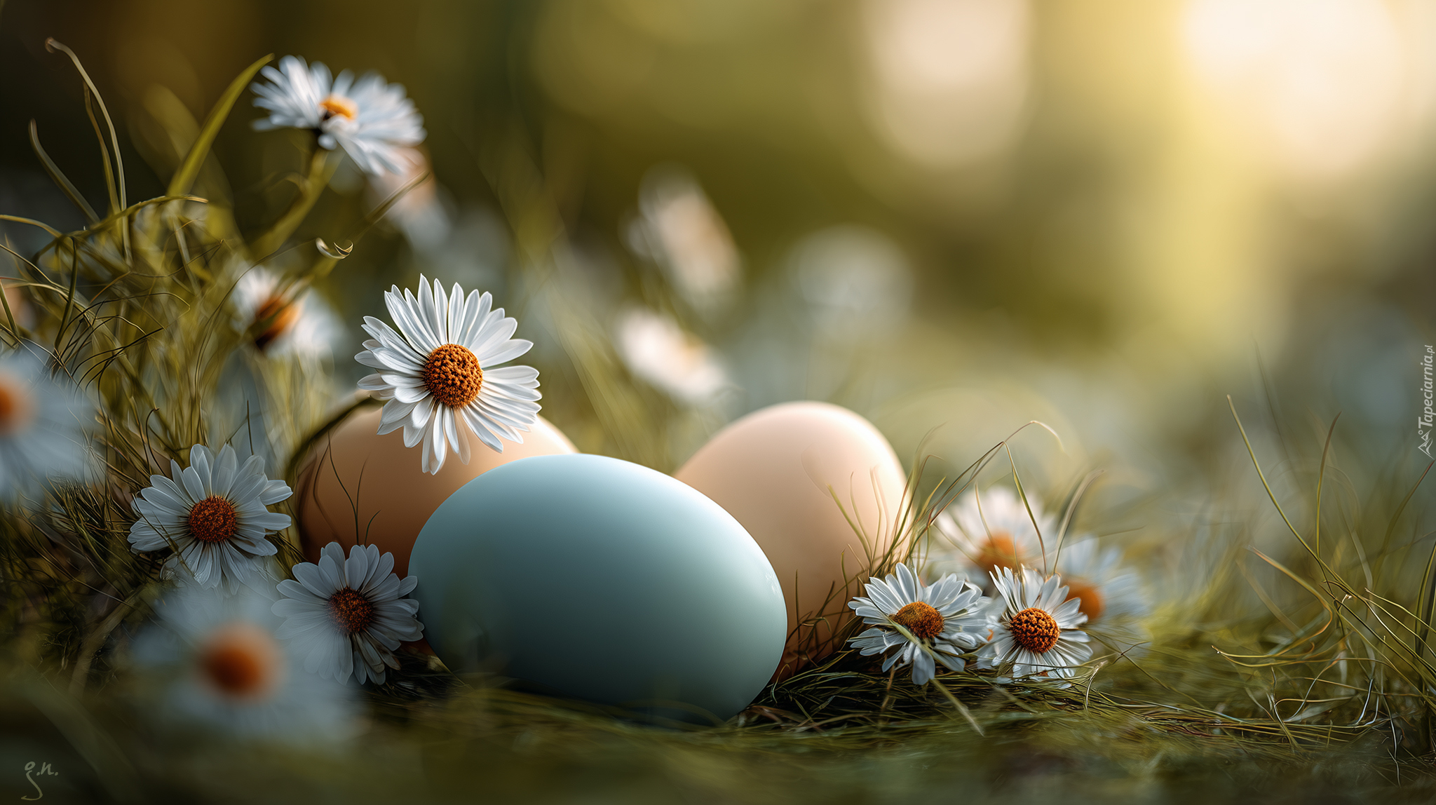 Edytor tapety: Kolorowe jajka i stokrotki na trawie