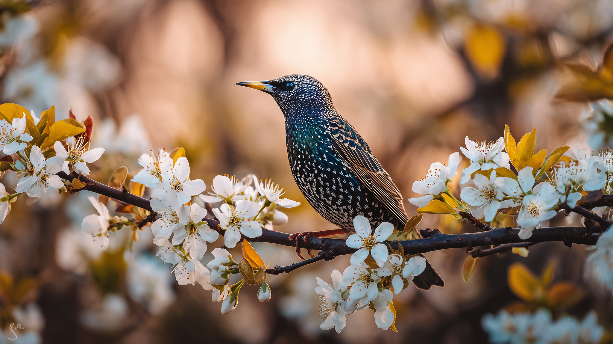 Edytor tapety: Szpak na ukwieconej gałązce drzewa owocowego