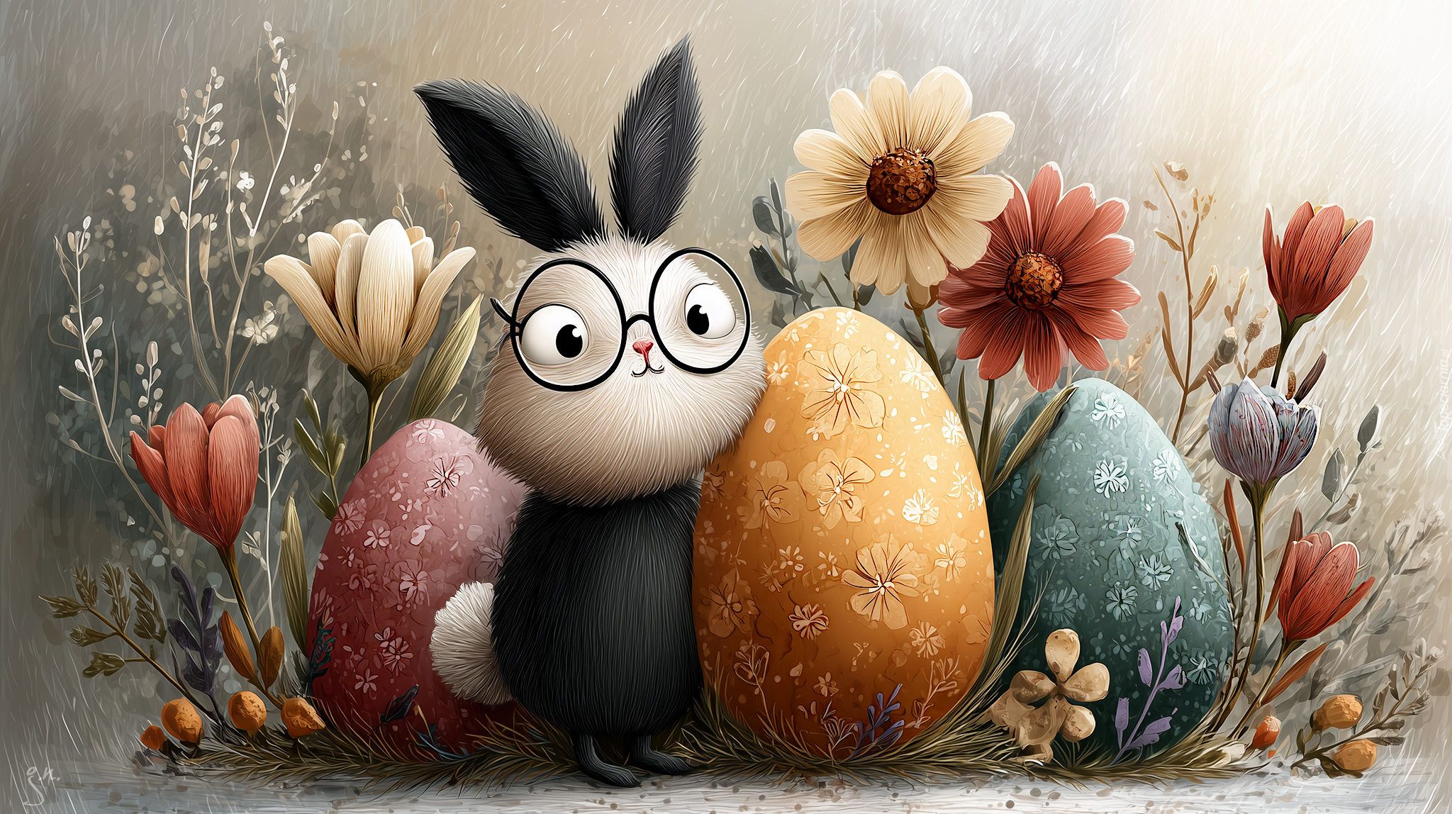 Edytor tapety: Zajączek i kolorowe pisanki wśród kwiatów