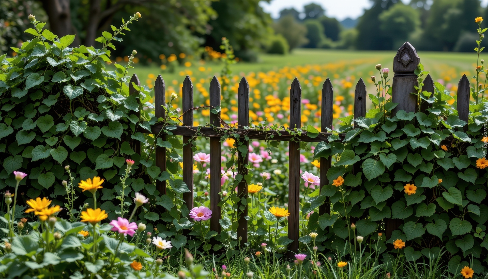 Edytor tapety: Ukwiecona łąka i pnące rośliny na płocie