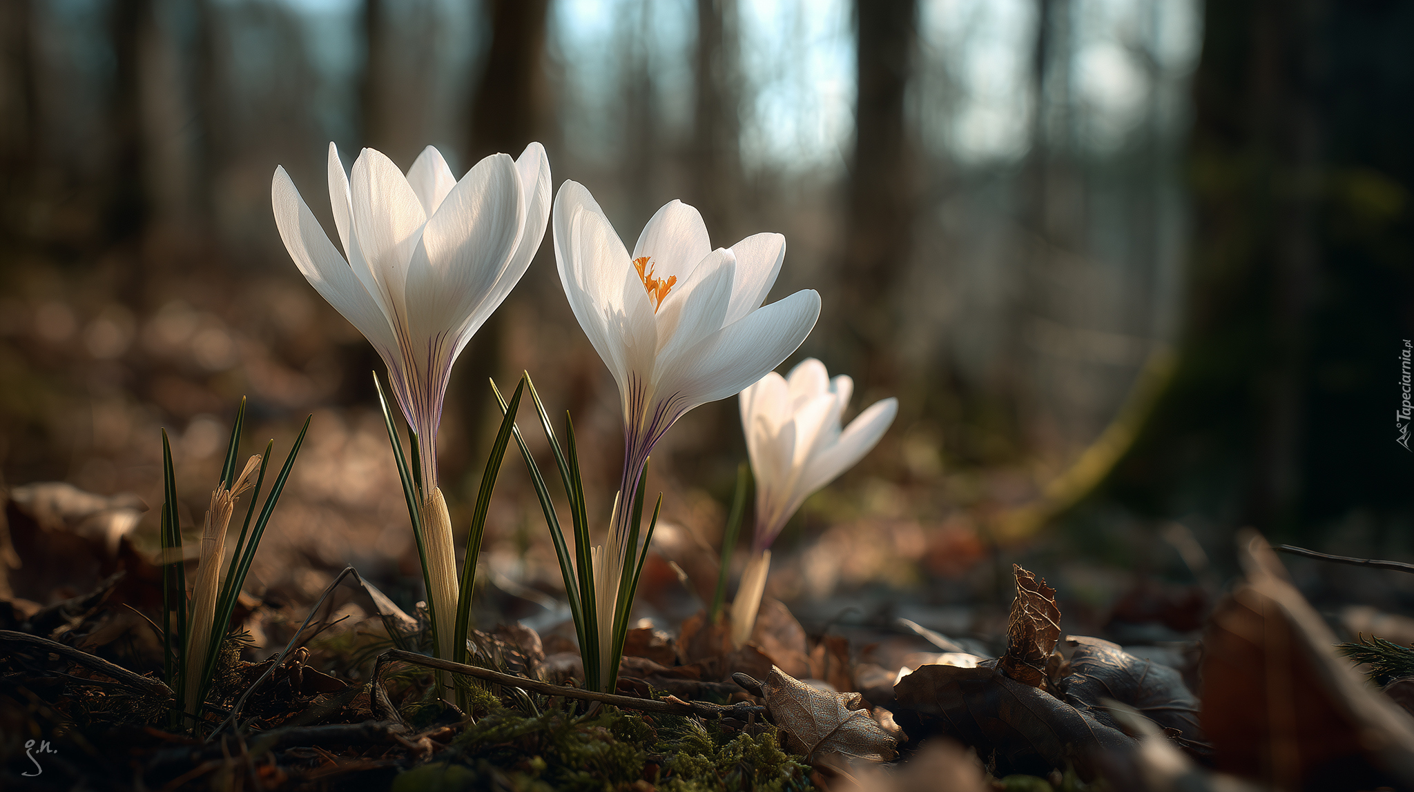 Edytor tapety: Białe krokusy rozświetlone słonecznym blaskiem
