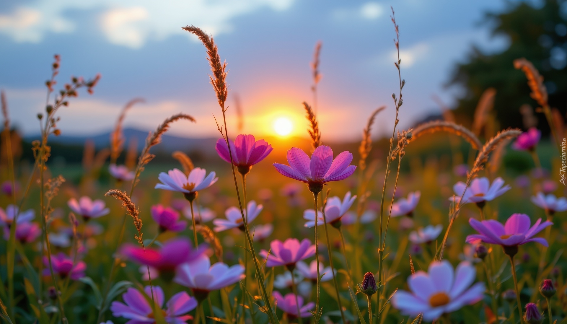 Edytor tapety: Kosmea i trawy w blasku zachodzącego słońca