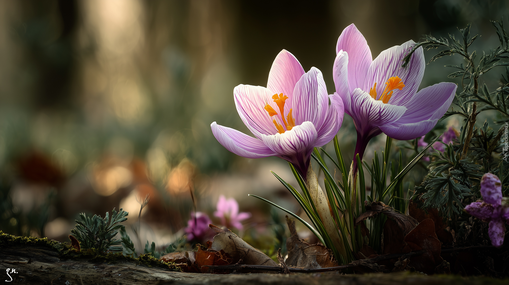 Edytor tapety: Dwa jasnofioletowe krokusy w grafice AI