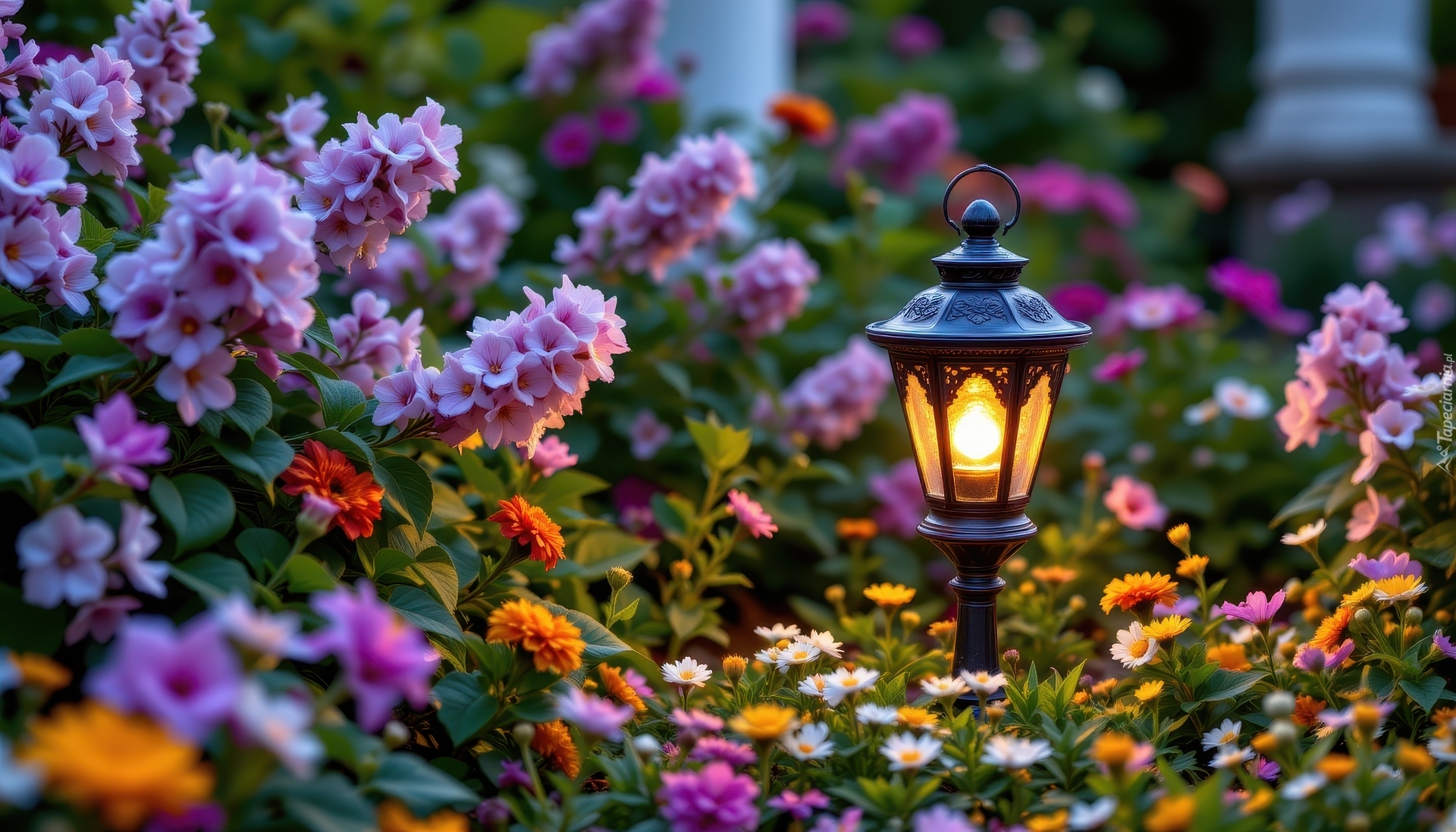 Edytor tapety: Zapalona lampa wśród kwiatów w ogrodzie