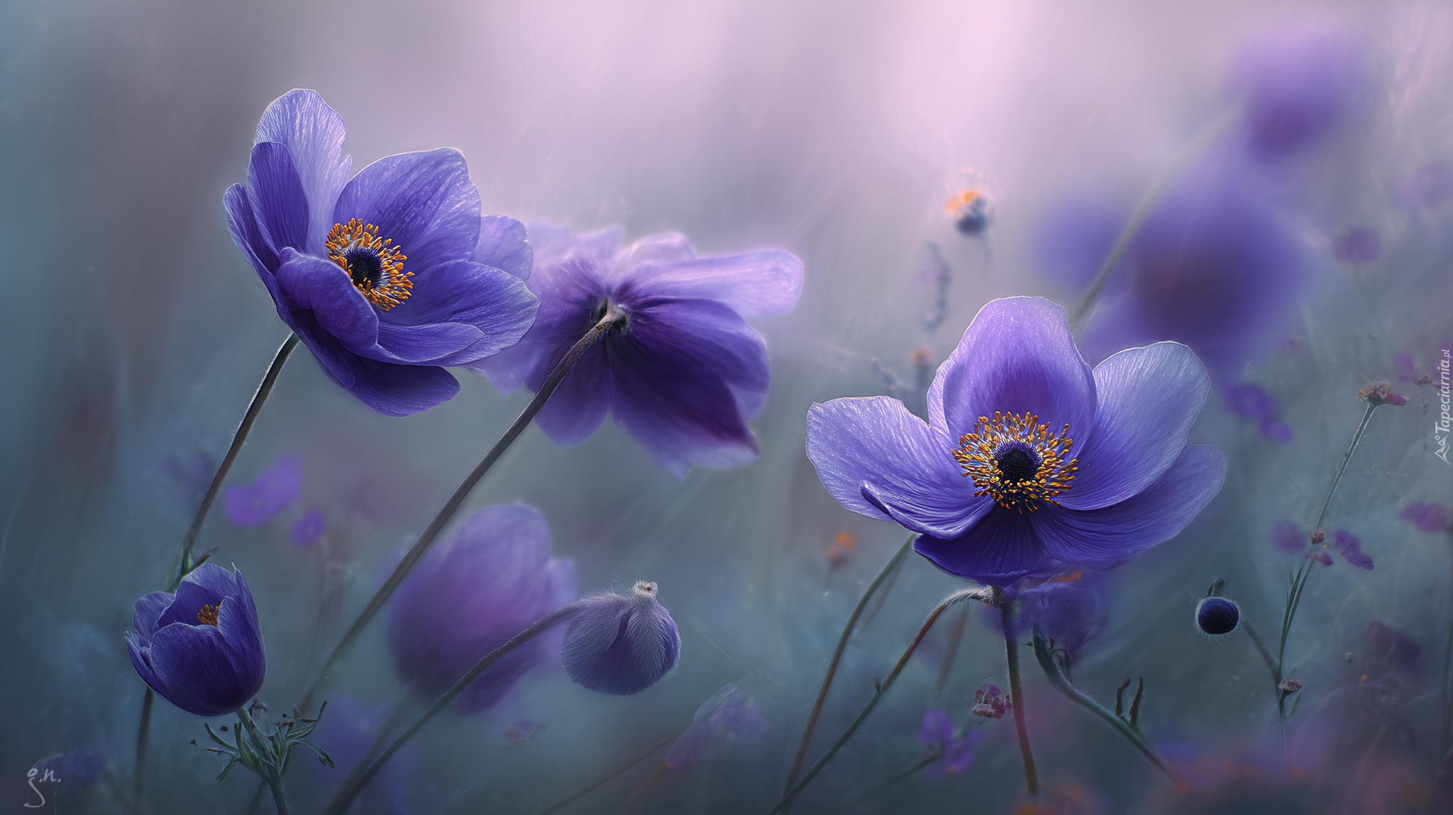 Edytor tapety: Fioletowe zawilce na rozświetlonym tle w grafice AI