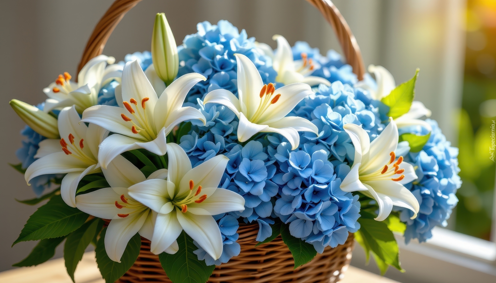 Edytor tapety: Białe lilie i niebieskie hortensje w koszyku