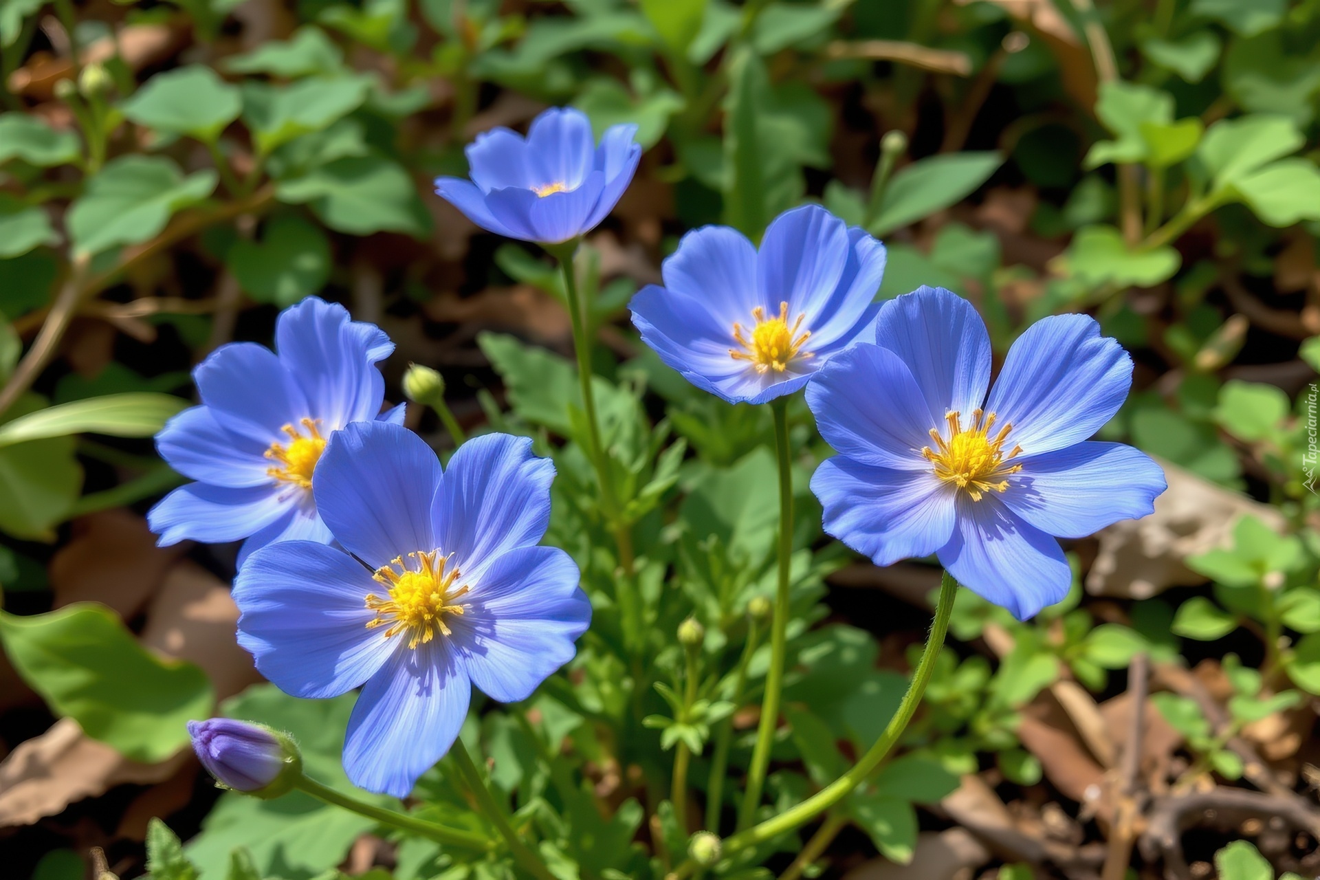 Edytor tapety: Rozświetlone słonecznym blaskiem rozkwitnięte niebieskie kwiaty w zbliżeniu