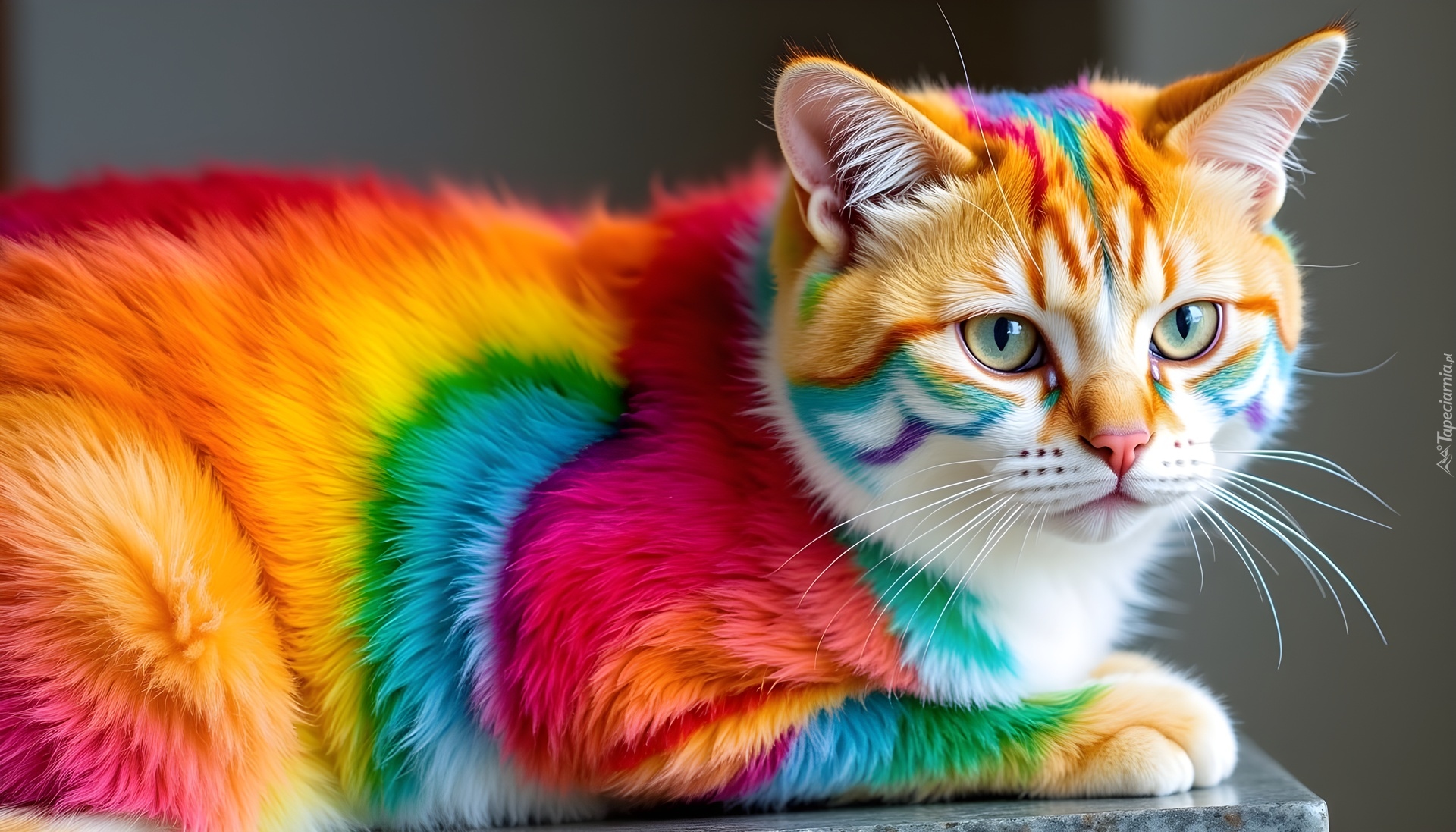 Edytor tapety: Kot z tęczowym futerkiem w grafice AI
